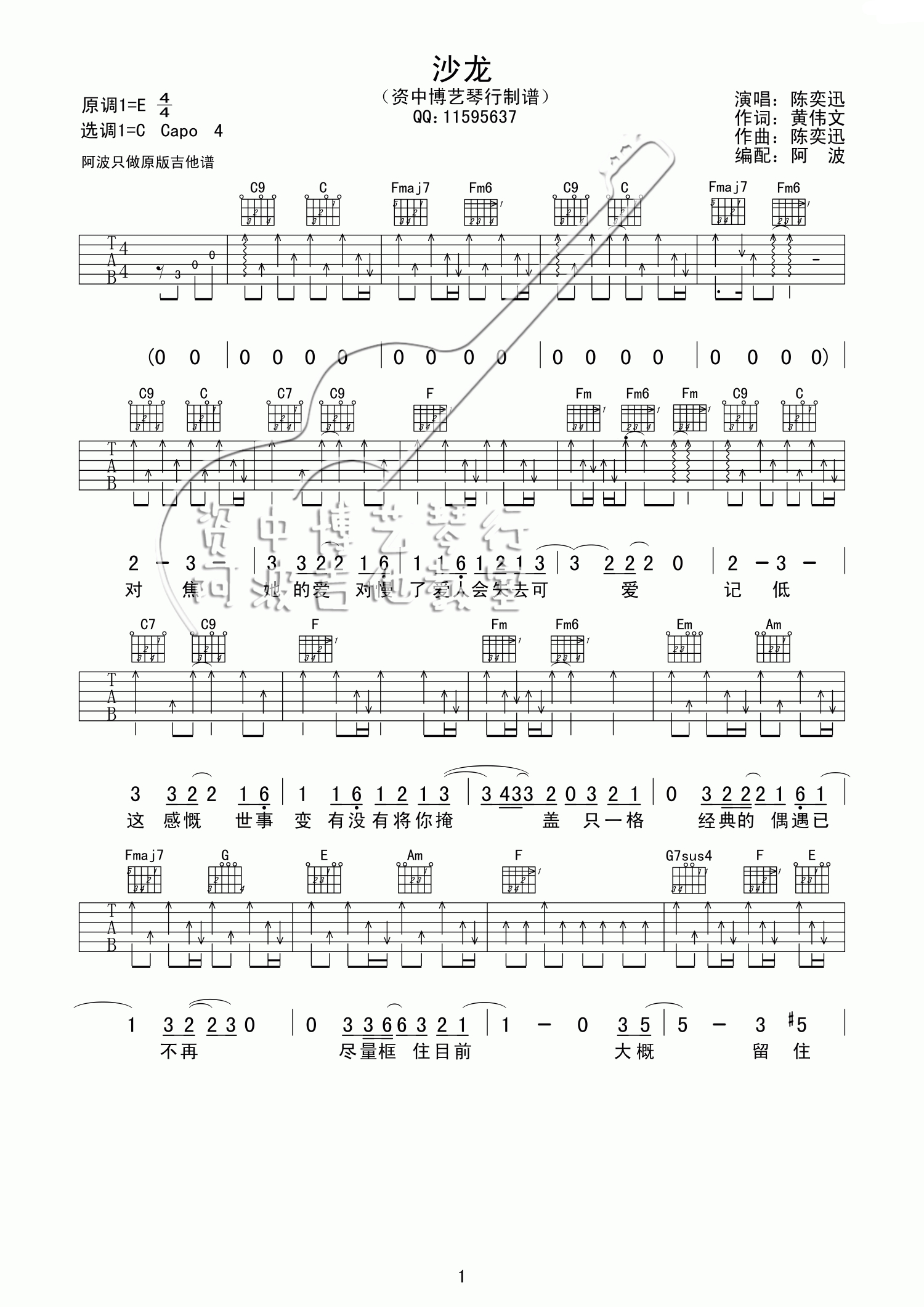 曲谱介绍: 陈奕迅《沙龙》吉他谱 C调高清版