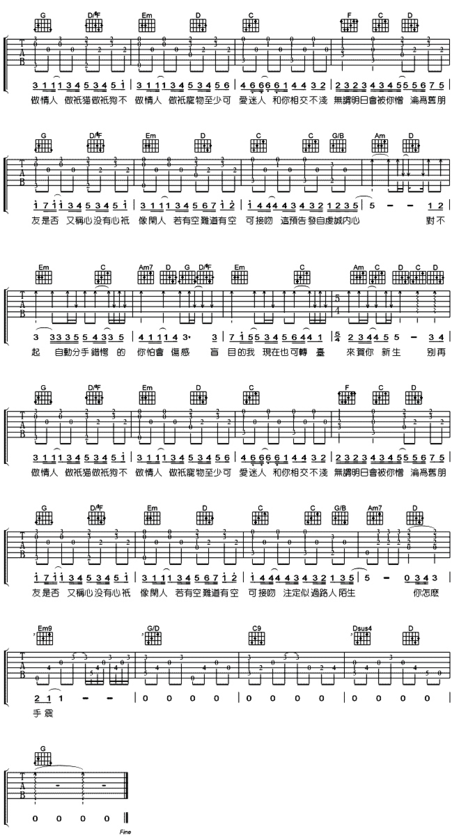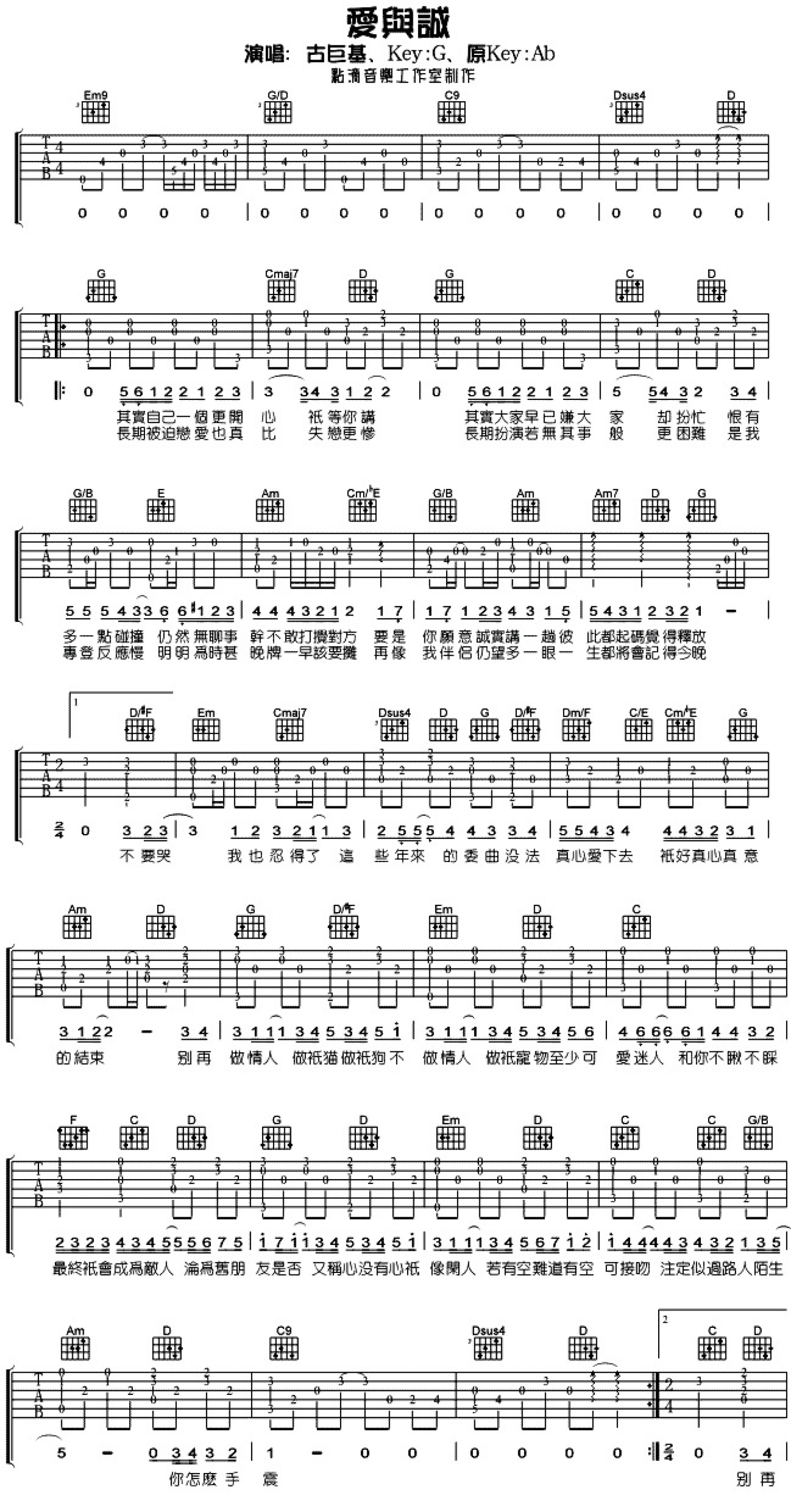 曲谱介绍: 古巨基爱与诚吉他谱,原调Ab,变调夹夹一品,爱与诚吉他弹唱谱,六线谱选用G调编配。以前不明白《爱与诚》的意思,也没想过要深究。今天跑步听到一段旋律,忽然想起这首歌。X与X的句式,前后者不是顺同,便是对立。通过夕爷一首歌的篇幅,诚的意思并不是爱,而是不爱,翻译成俗套的名字就是《爱与不爱》。然而不爱才是诚实的,更添酸苦。