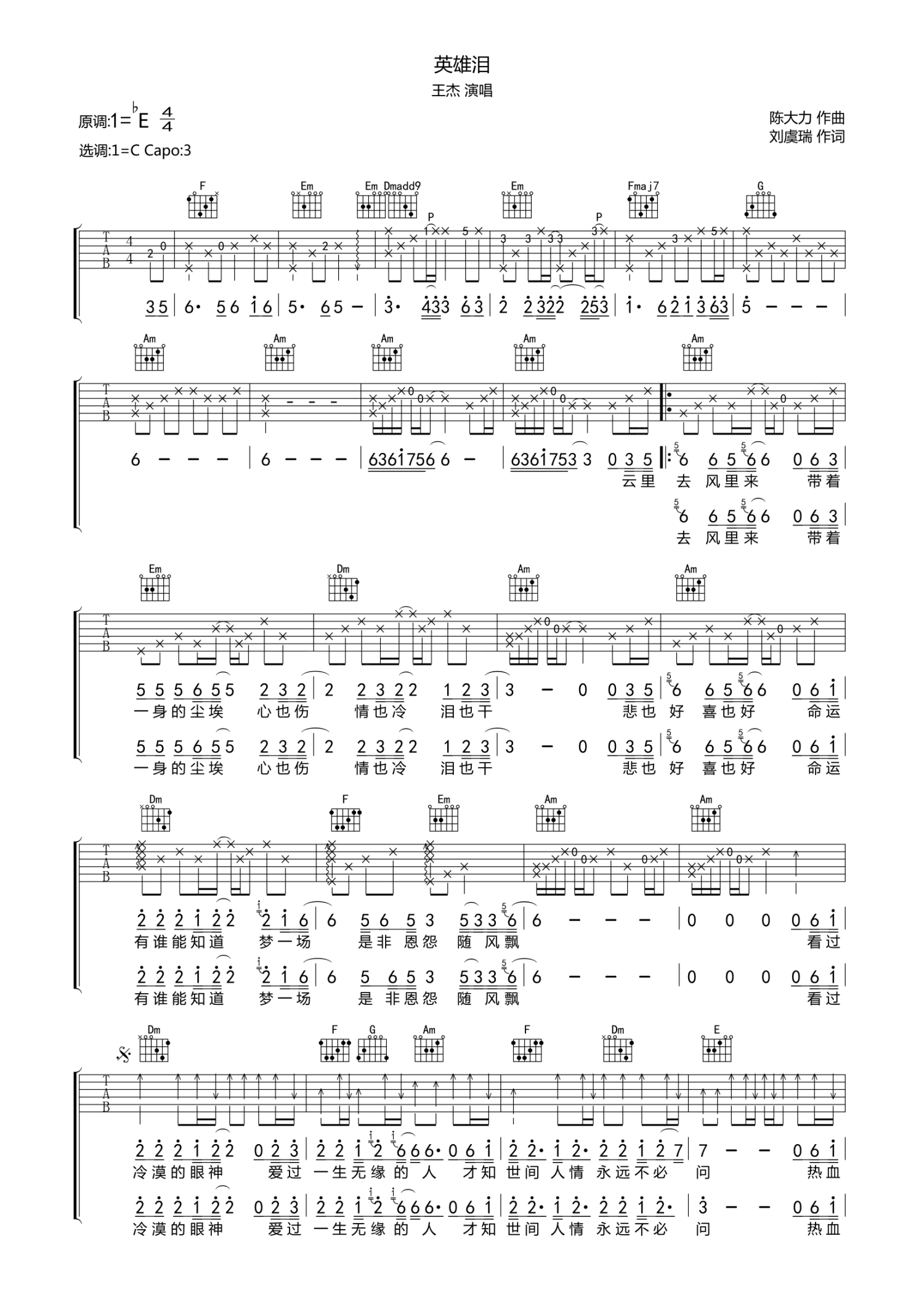 曲谱介绍: 王杰《英雄泪》吉他谱_C调吉他弹唱谱