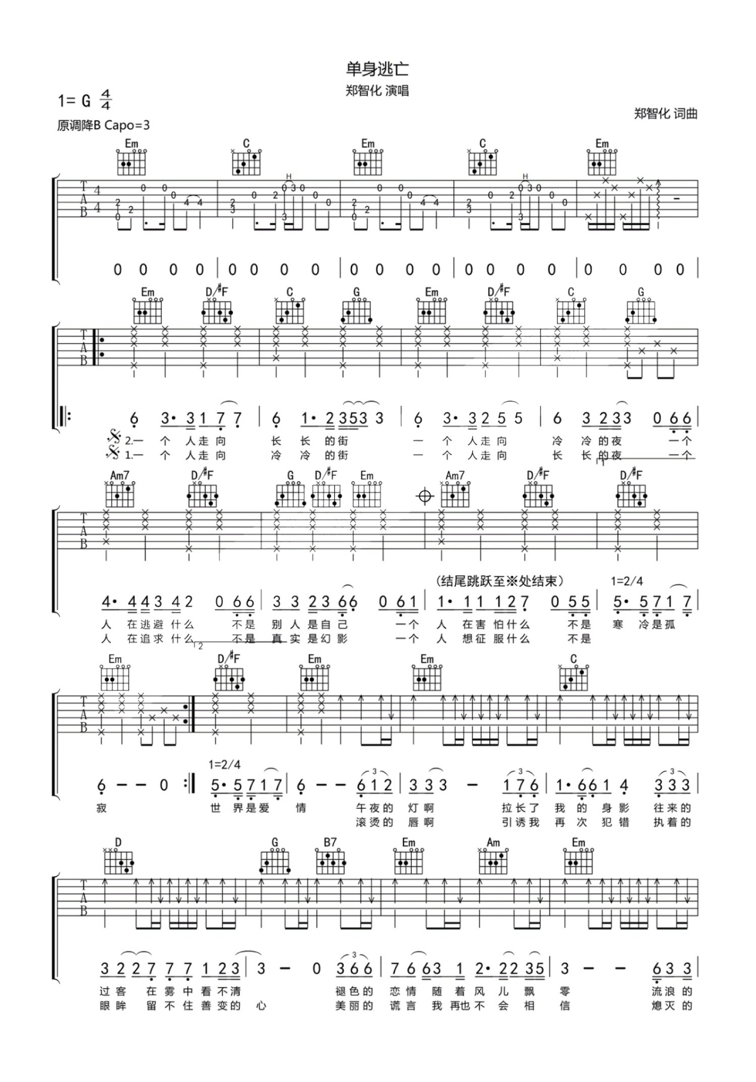 曲谱介绍: 郑智化《单身逃亡》吉他谱_G调吉他弹唱谱