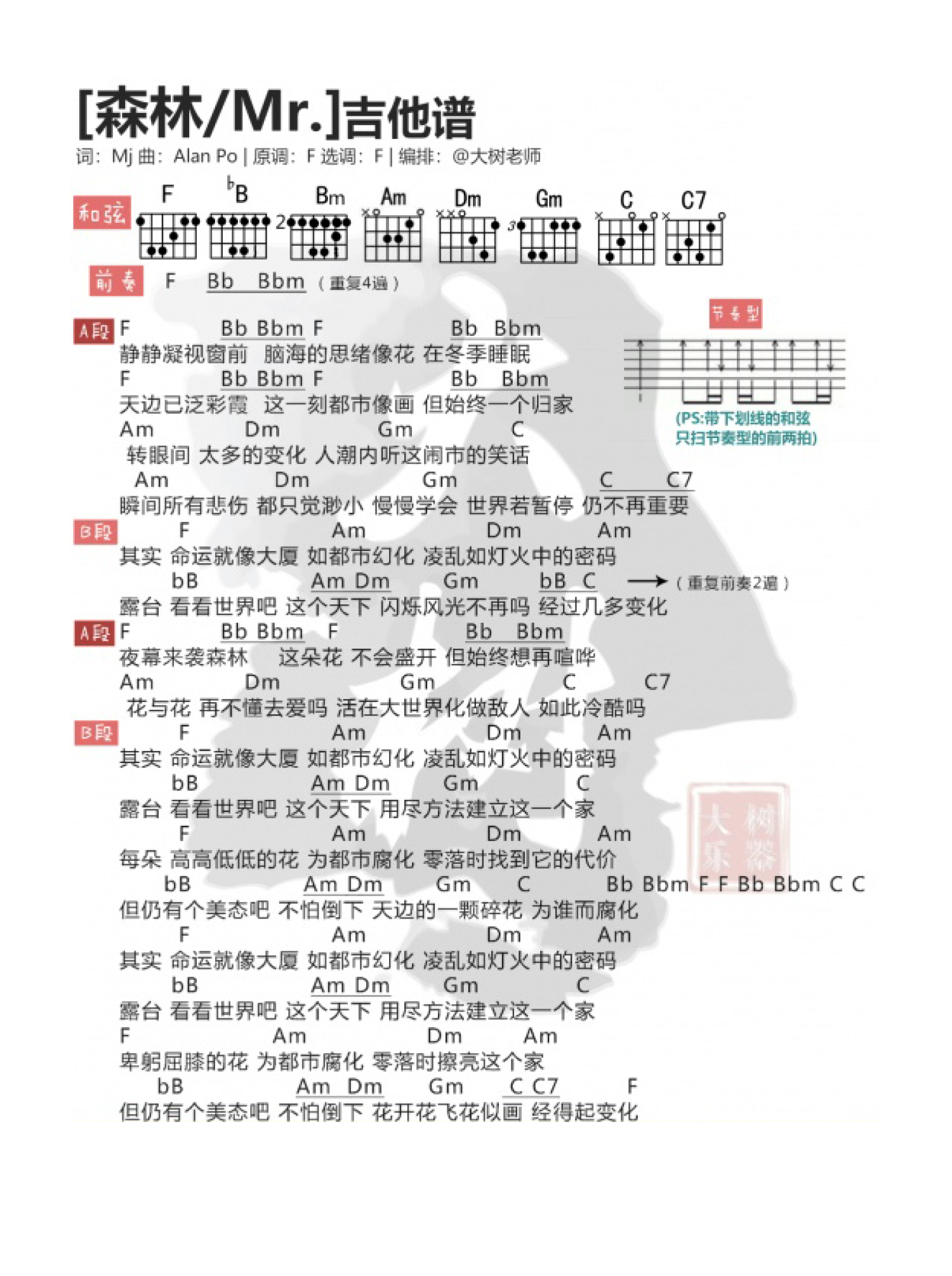 曲谱介绍: Mr.《森林》吉他谱_F调吉他弹唱谱_和弦谱