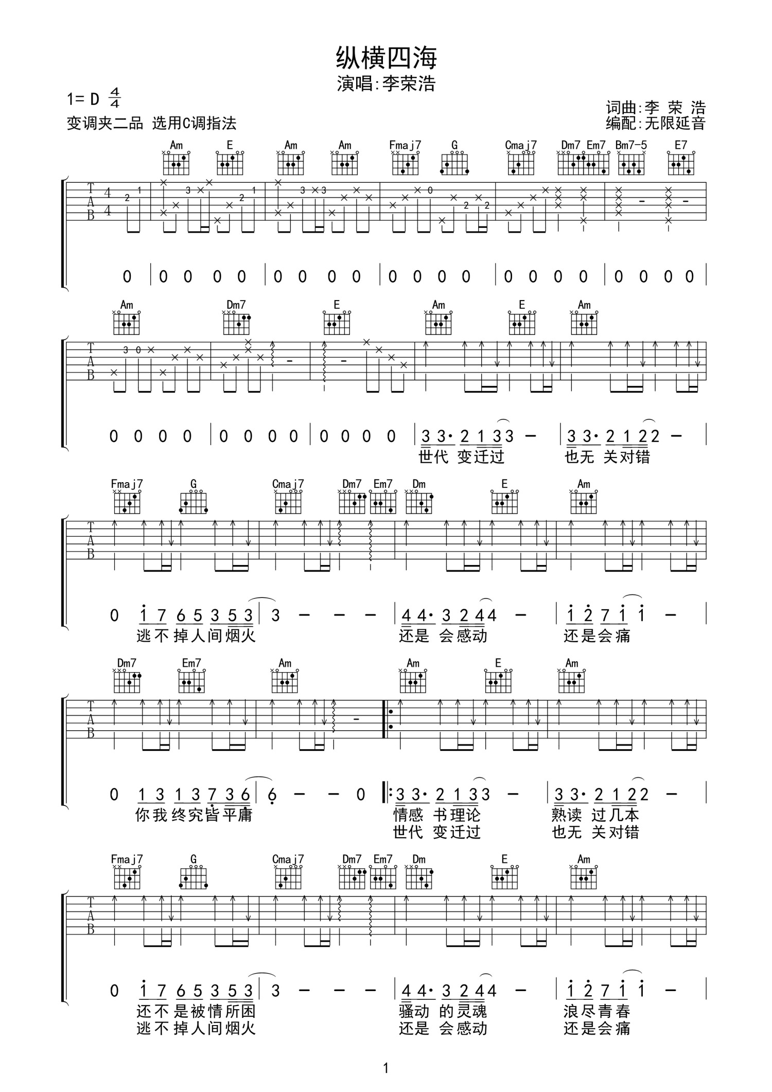 曲谱介绍: 李荣浩《四海纵横》吉他谱_C调吉他弹唱谱