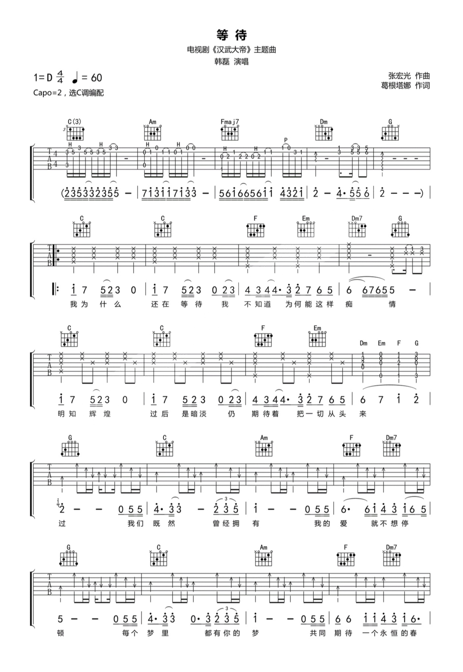 曲谱介绍: 韩磊《等待》吉他谱_C调吉他弹唱谱