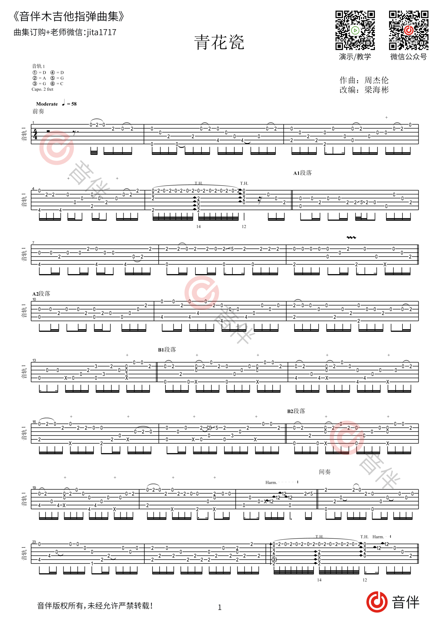 曲谱介绍: 周杰伦《青花瓷》吉他谱_吉他独奏谱