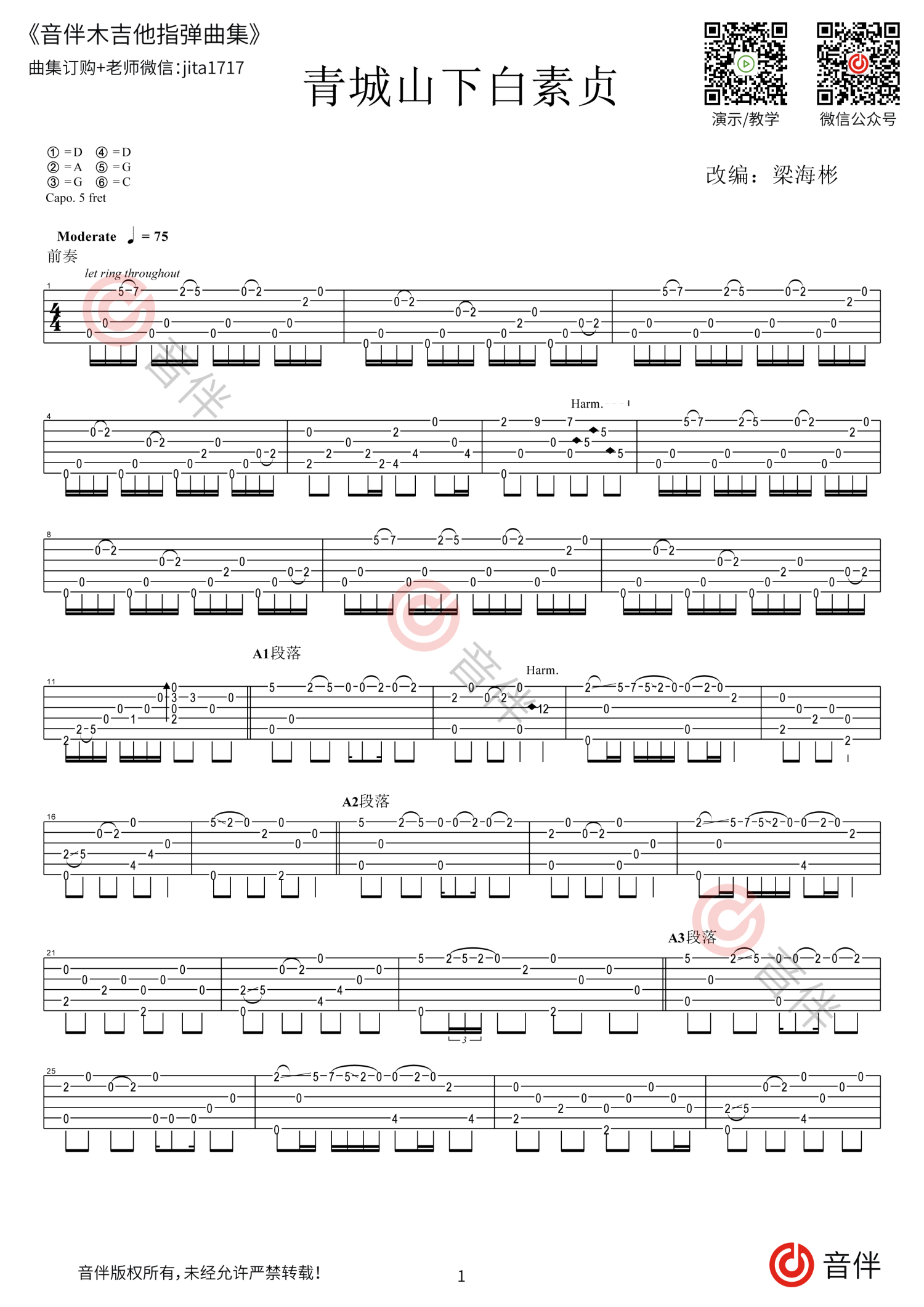 曲谱介绍: 一首中国风指弹改编《青城山下白素贞》指弹吉他谱。本曲调音:6弦-C、5弦-G、4弦-D、3弦-G、2弦-A、1弦-D,然后变调夹夹5品。