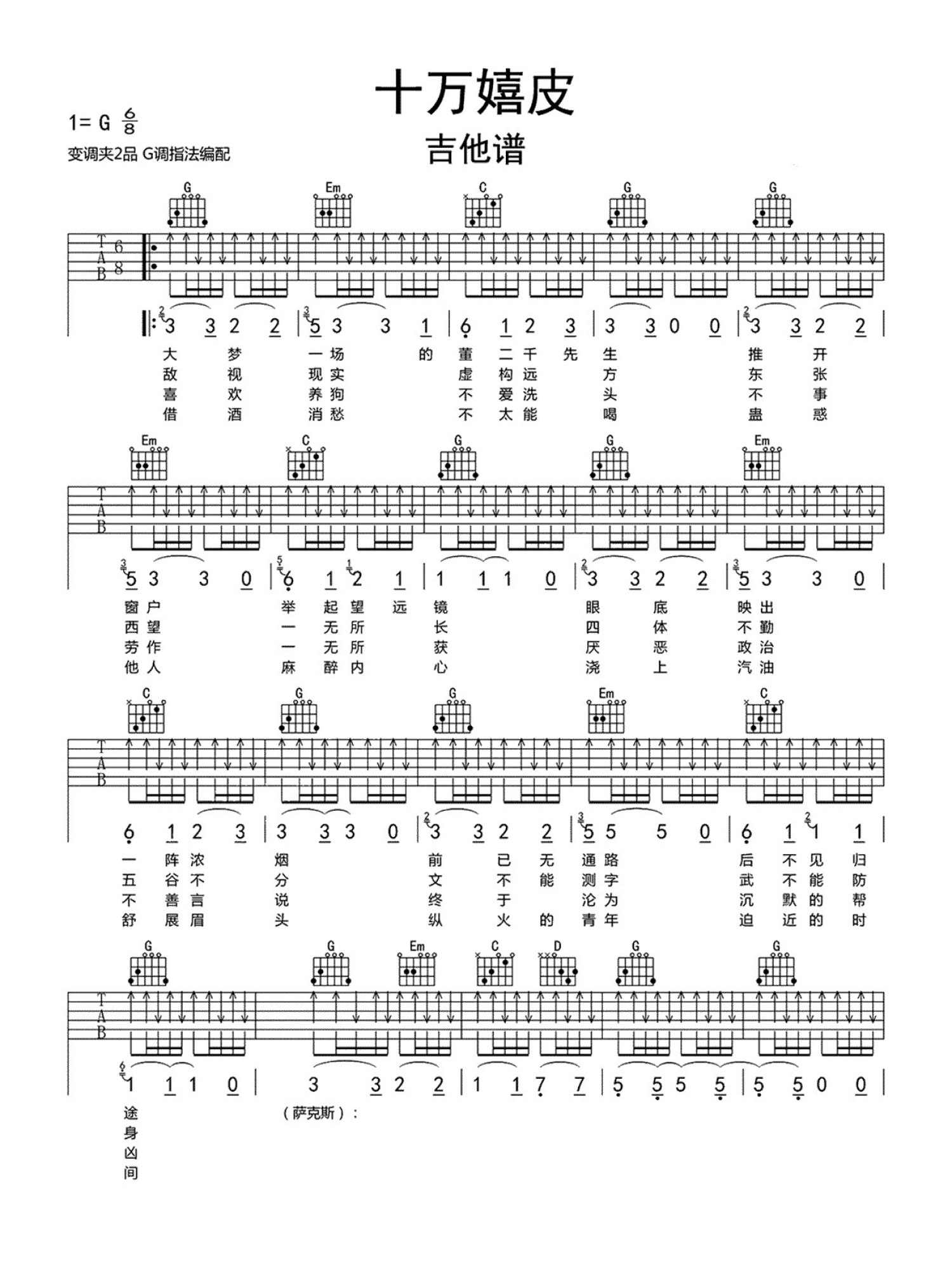曲谱介绍: 万能青年旅店《十万嬉皮》吉他谱_G调吉他弹唱谱
