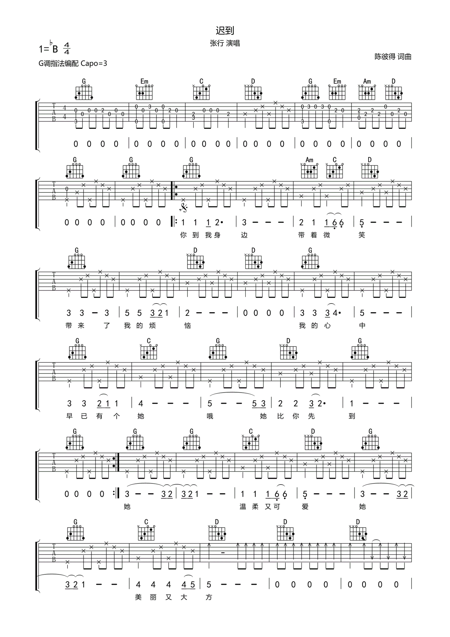 • 迟到吉他谱 - 张行 - G调吉他弹唱谱第1张