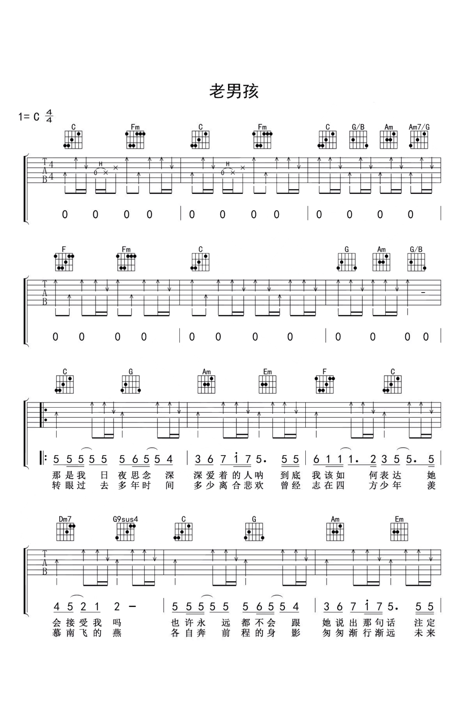 曲谱介绍: 老男孩吉他谱,筷子兄弟演唱的一首经典代表歌曲,原版歌曲是日本创作型歌手大桥卓弥的《ありがとう》,老男孩六线谱,C调指法编配,配合教学视频,本期基础教学讲解扫弦时击弦技巧练习。打开节拍器,让我们开始吧。