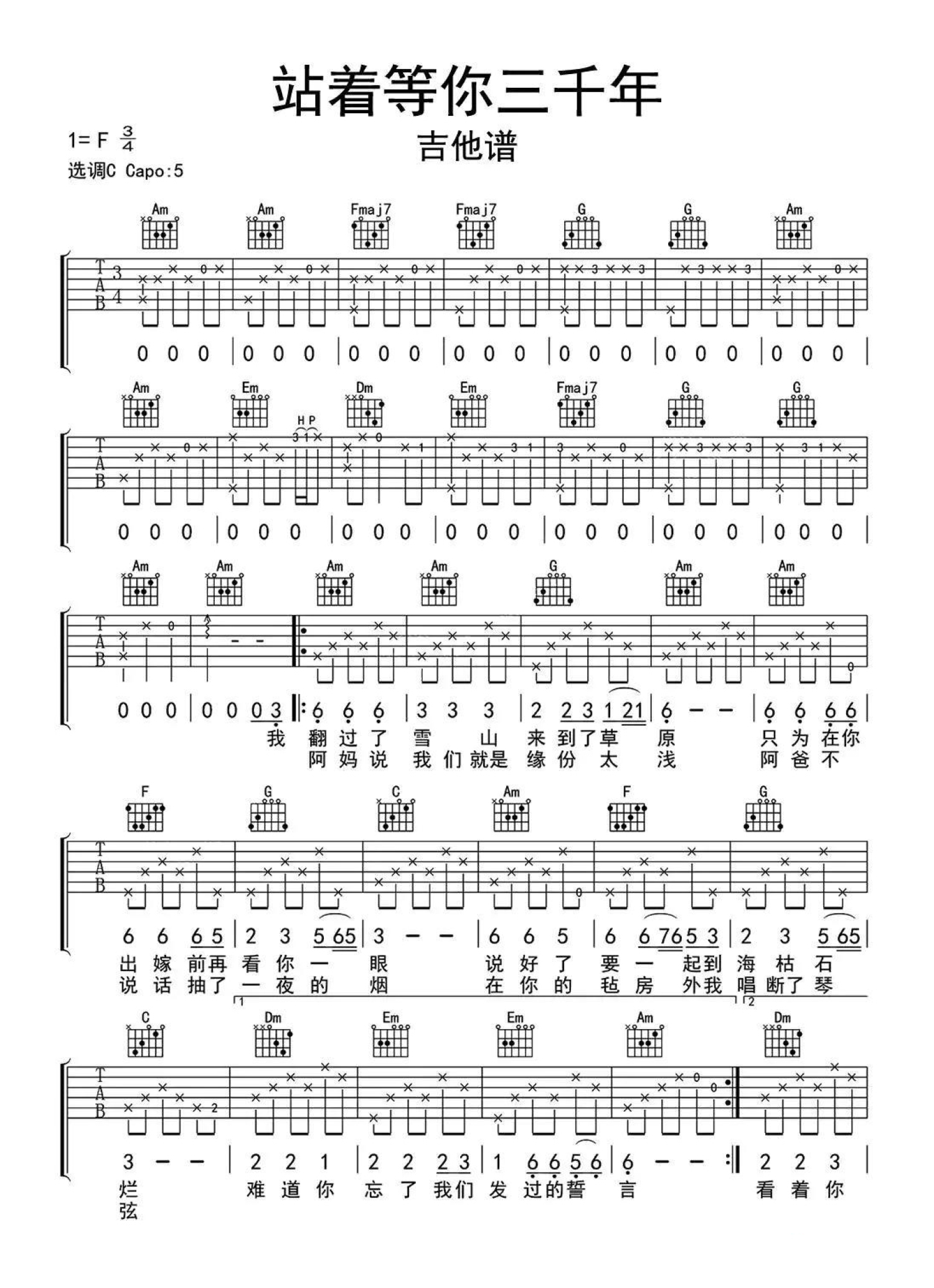 曲谱介绍: 王琪《站着等你三千年》吉他谱_C调吉他弹唱谱