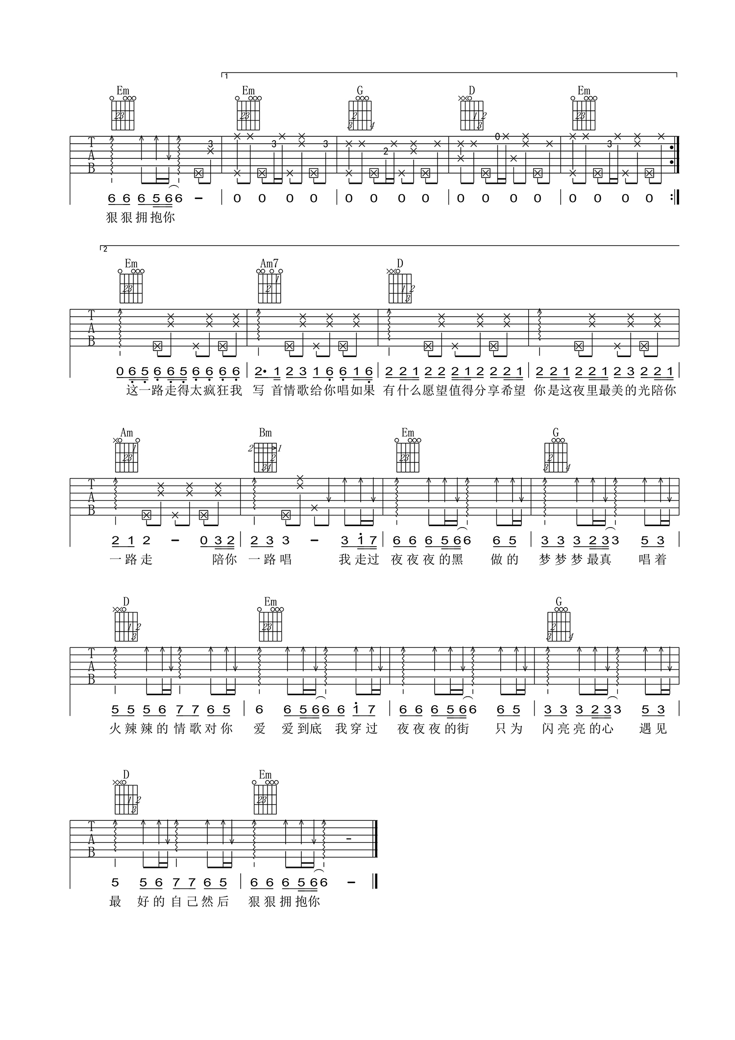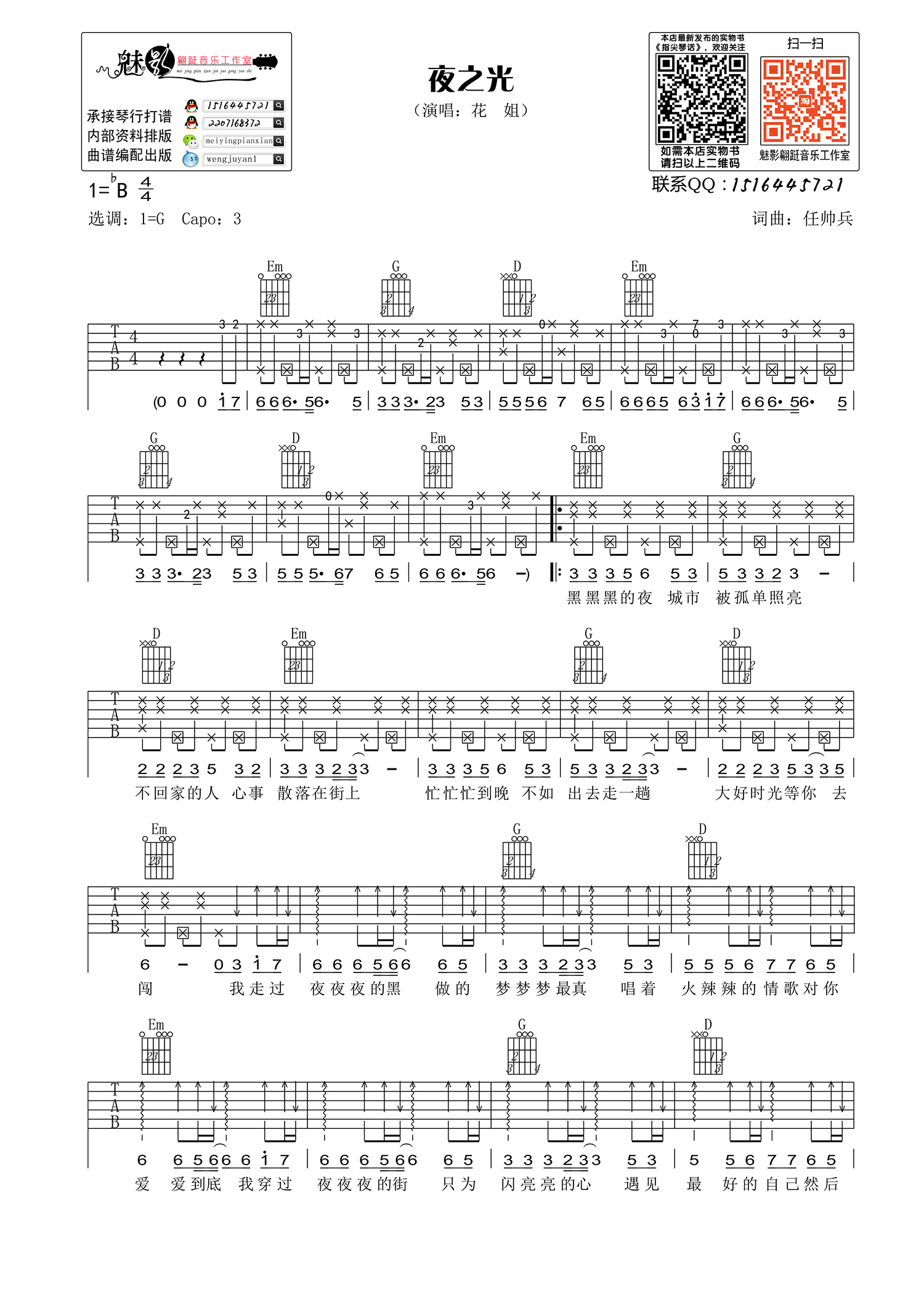 曲谱介绍: 《夜之光》花姐 吉他谱 六线谱