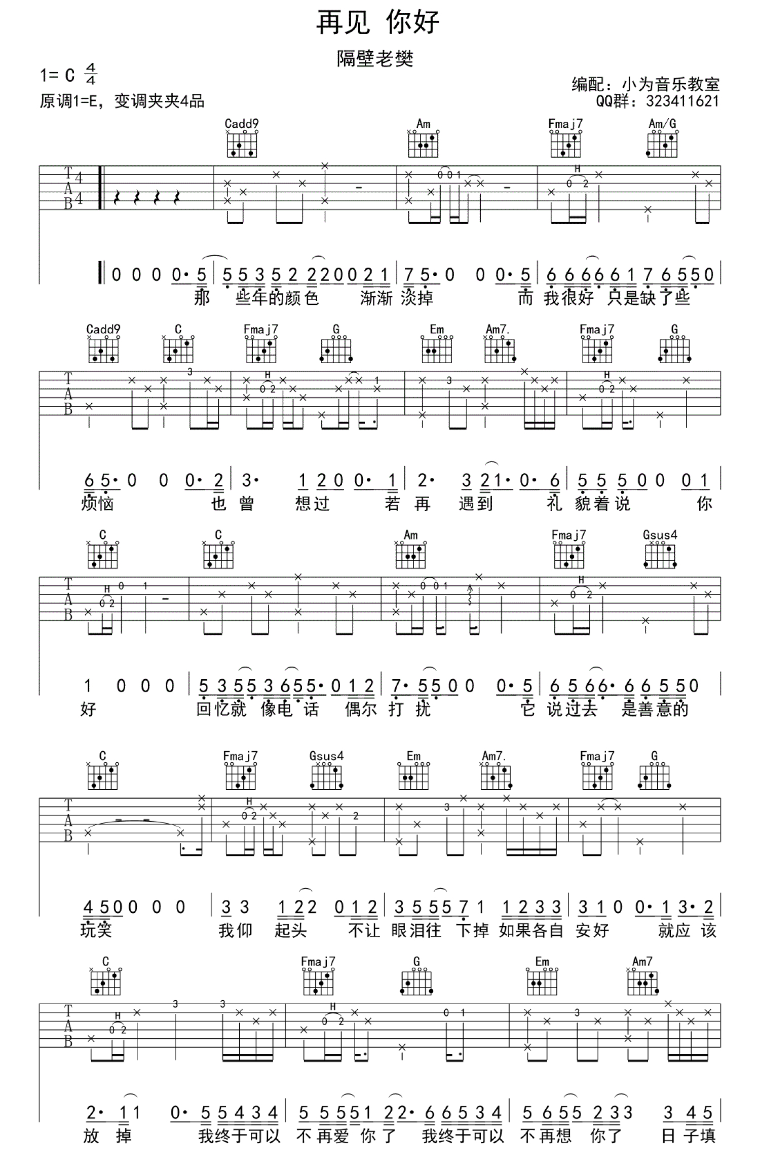 再见你好吉他谱 - 隔壁老樊 - C调吉他弹唱谱