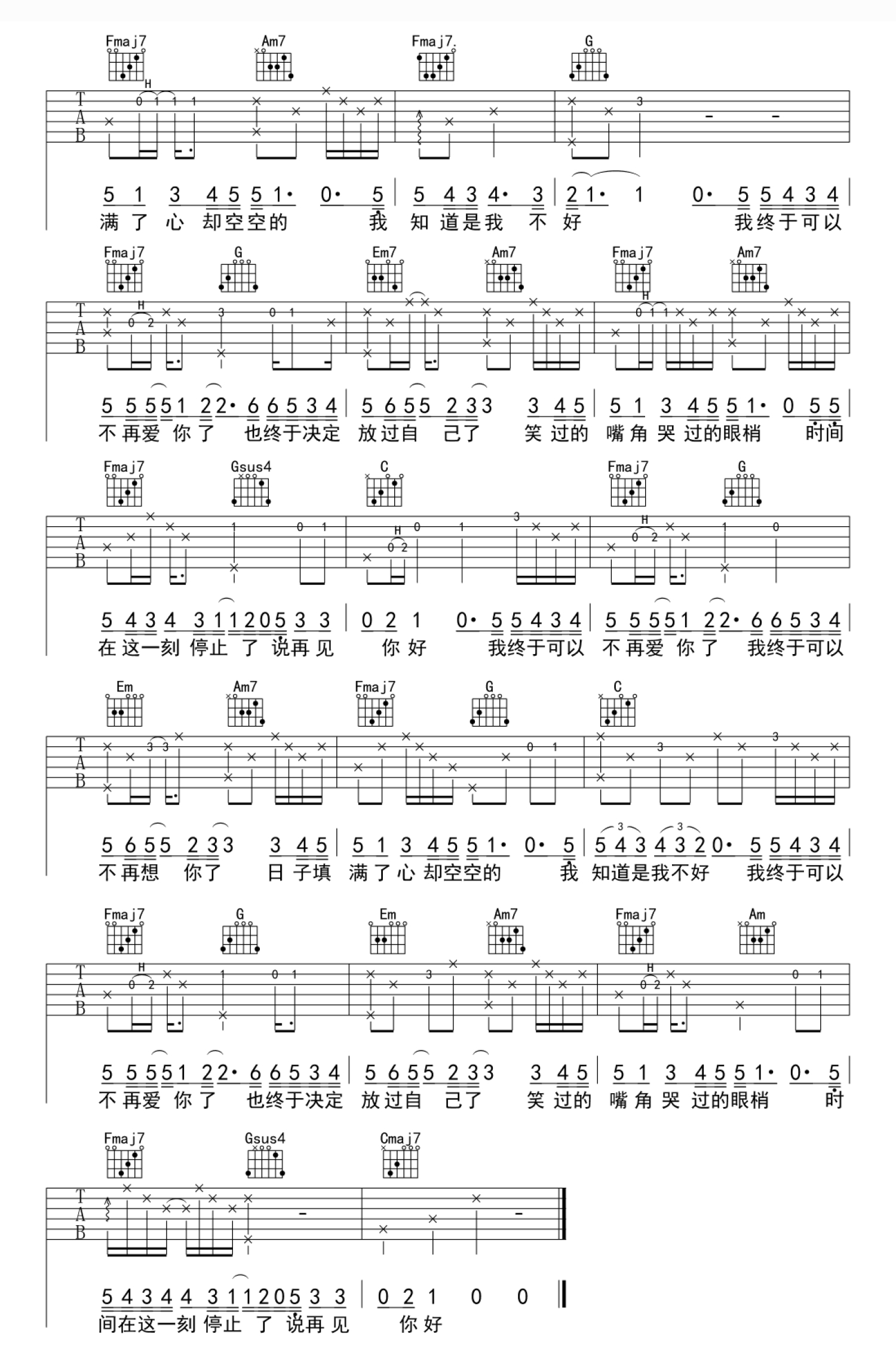 曲谱介绍: 《再见你好》吉他谱,隔壁老樊演唱,原调E,选用C调指法,变调夹夹第四品。我终于可以不再爱你了,我终于可以不再想你了。这是金玟岐词曲原唱的作品,也是《请爱我的女朋友》电影主题曲,抖音上经常刷到,隔壁老樊的翻唱绝对是最能打动人心的。