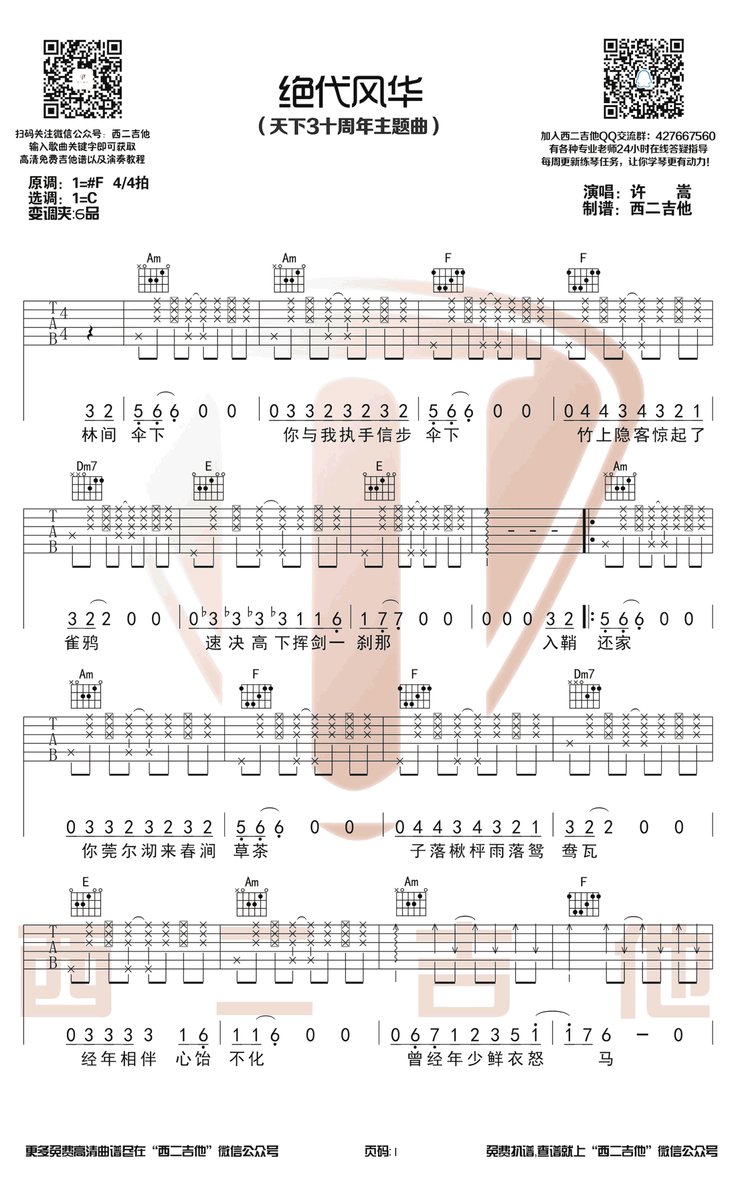 曲谱介绍: 绝代风华吉他谱,许嵩为《天下3》创作的一首古风主题曲,绝代风华六线谱,原调升F,选用C调指法编配,变调夹夹第五品。暌违数年的许氏中国风惊艳回归,再现江湖,绝代风华是情人,漫天的江山风景抵不过你那一抹笑靥;这绝代风华也是天下,是战场的金戈铁马,是信步山野诗酒花。