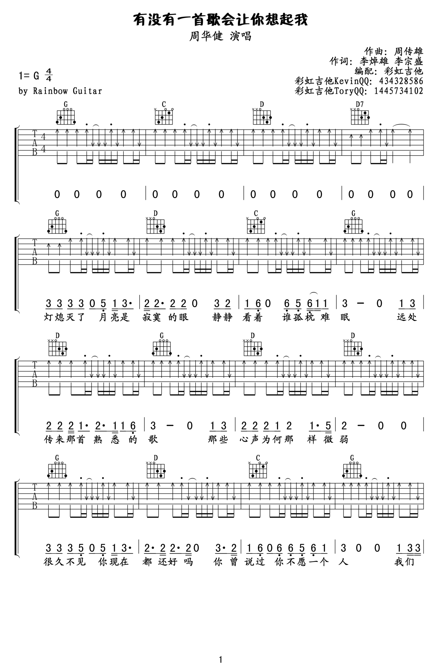 曲谱介绍: 周华健 有没有一首歌会让你想起我吉他谱