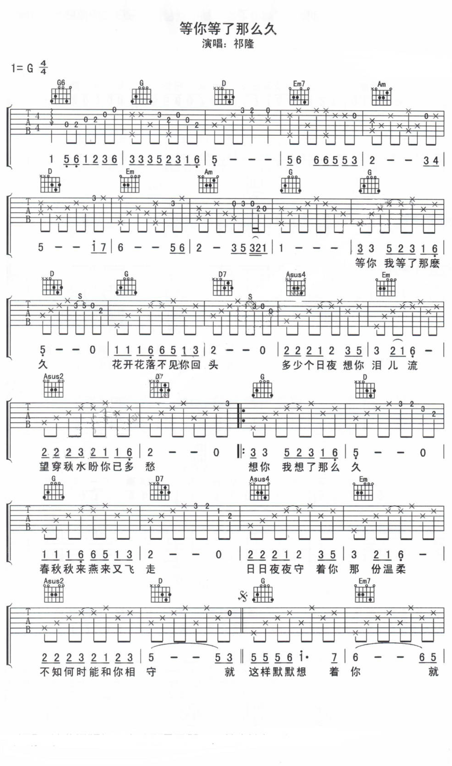 曲谱介绍: 祁隆《等你等了那么久》吉他谱_G调吉他弹唱谱