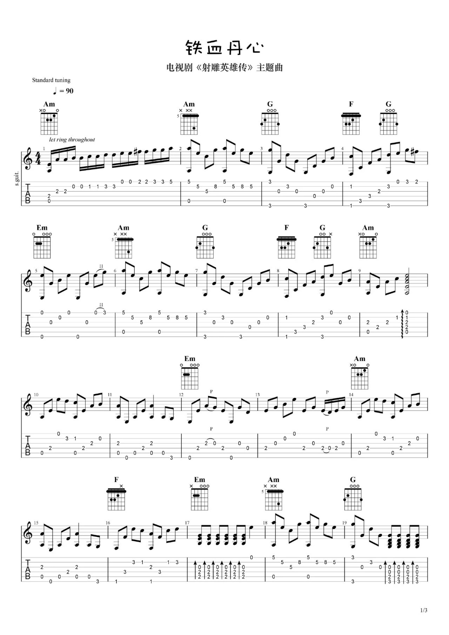 曲谱介绍: 射雕英雄传《铁血丹心》吉他谱_C调吉他独奏谱