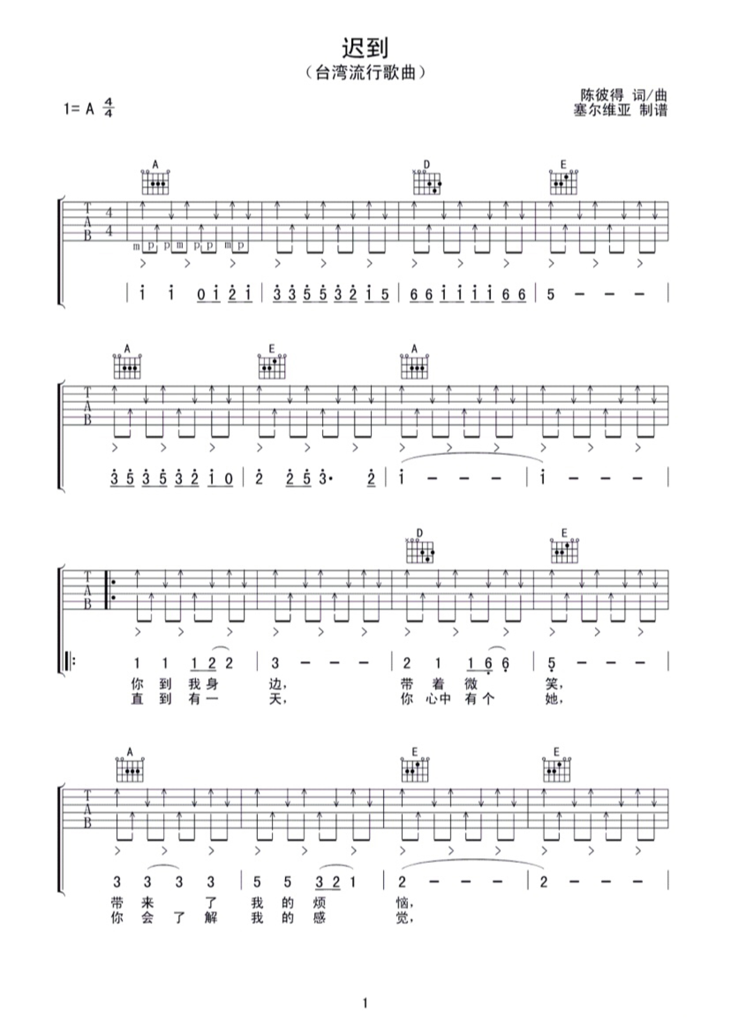 曲谱介绍: 刘文正《迟到》吉他谱_A调吉他弹唱谱