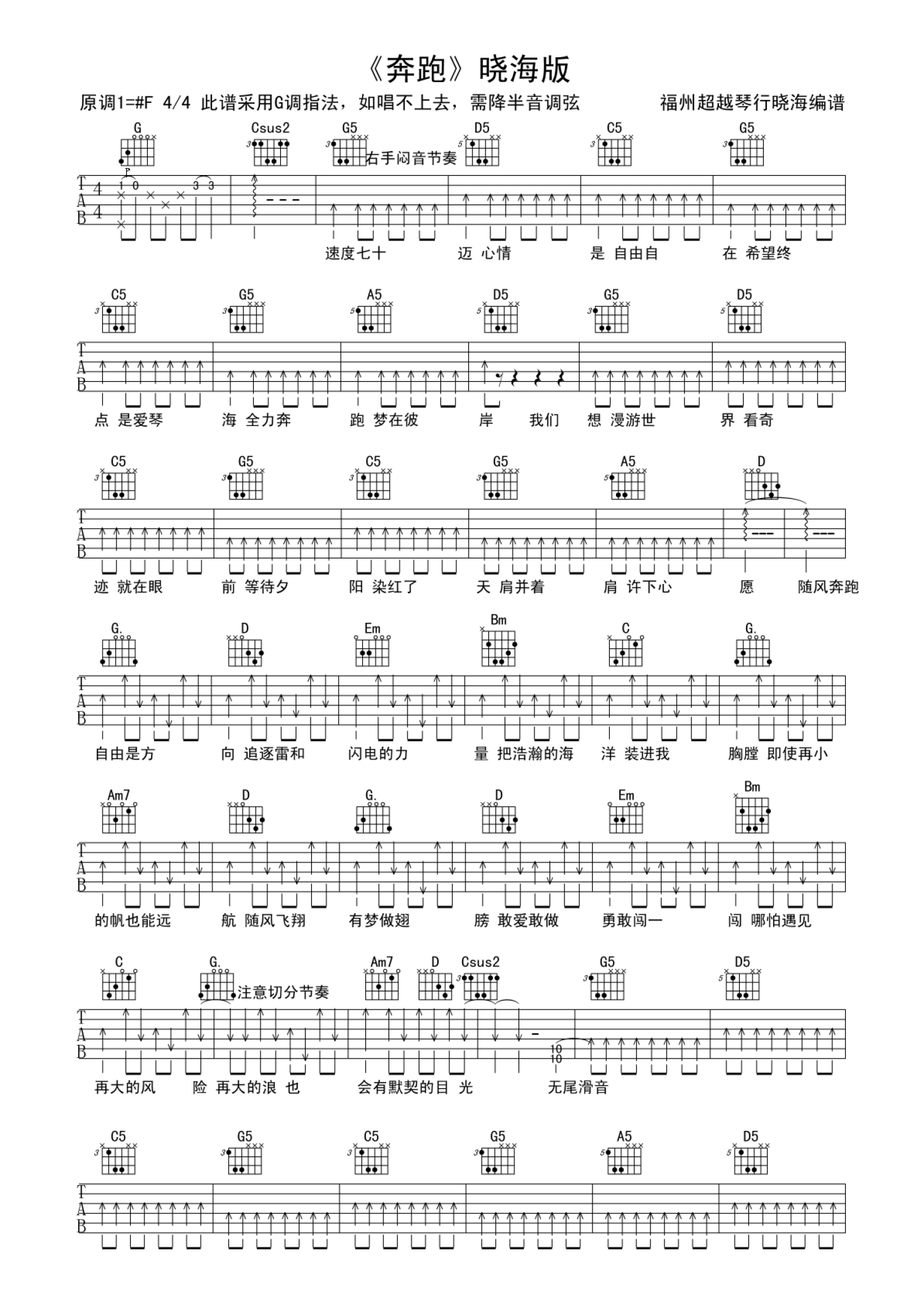 曲谱介绍: 羽泉奔跑吉他谱六线谱G调【高清版】