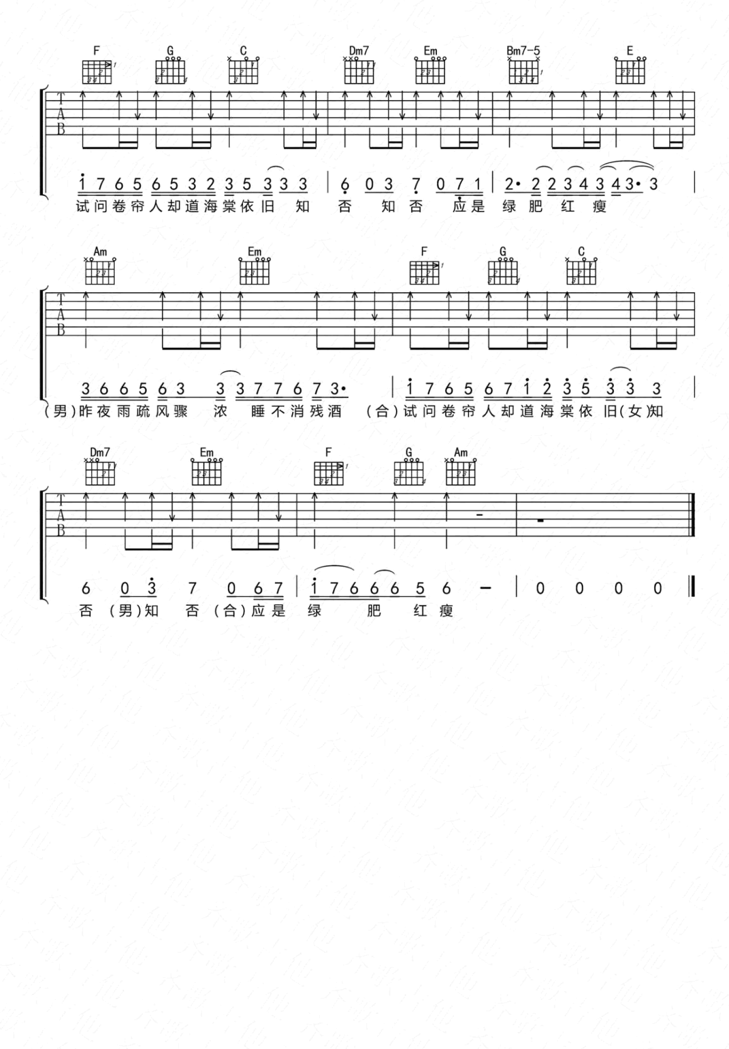 曲谱介绍: 知否知否吉他谱,郁可唯和胡夏演唱,原调D调,变调夹夹二品,采用李清照《如梦令》诗词创作的古风歌曲,男女唱和的歌声极具温柔,悠长婉转的旋律,几分伤感中又带着一丝丝的不屈。海棠依旧,应是绿肥红瘦。不知景何美,却闻声依旧。