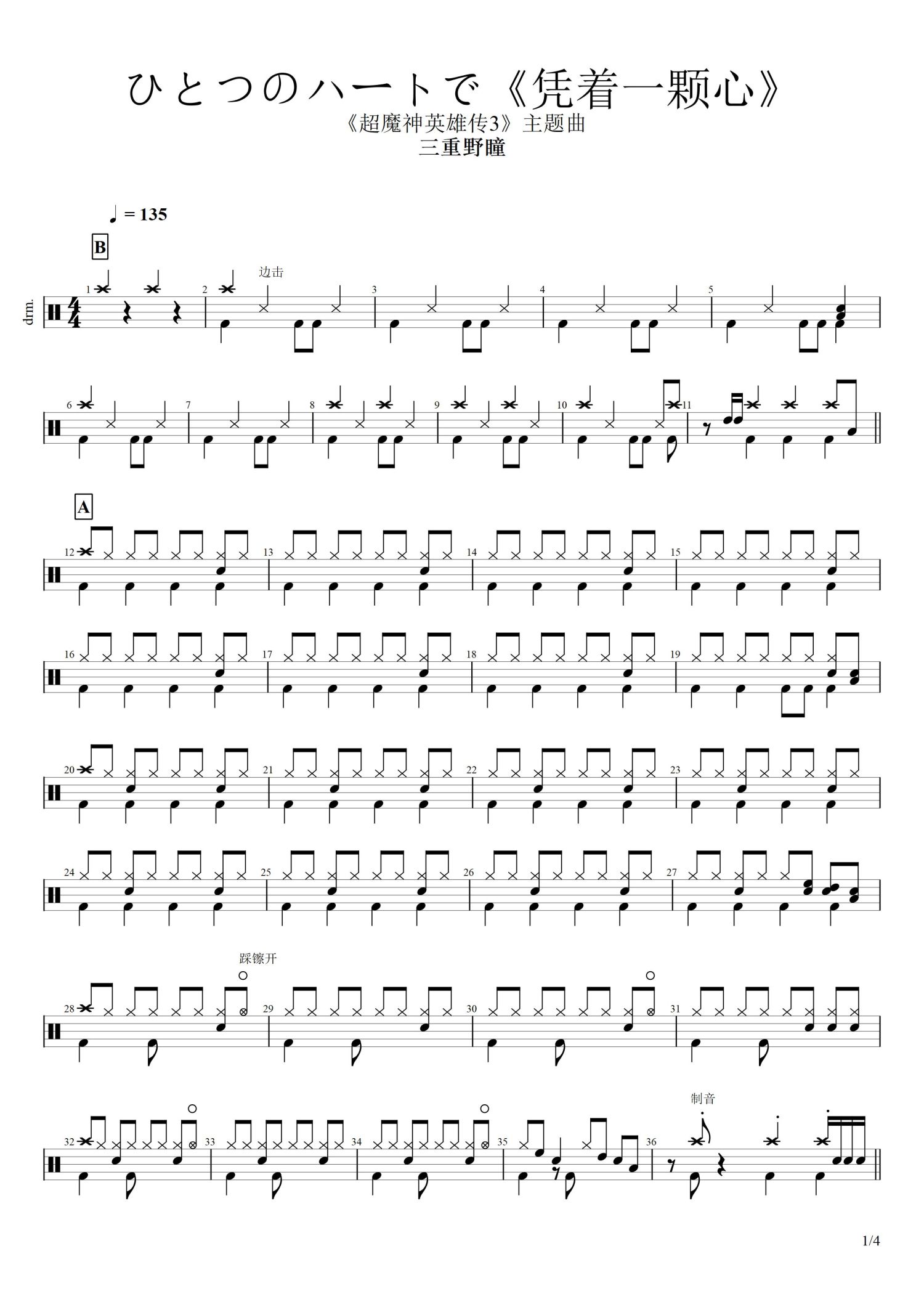 凭着一颗心鼓谱 - 三重野瞳 - 架子鼓谱