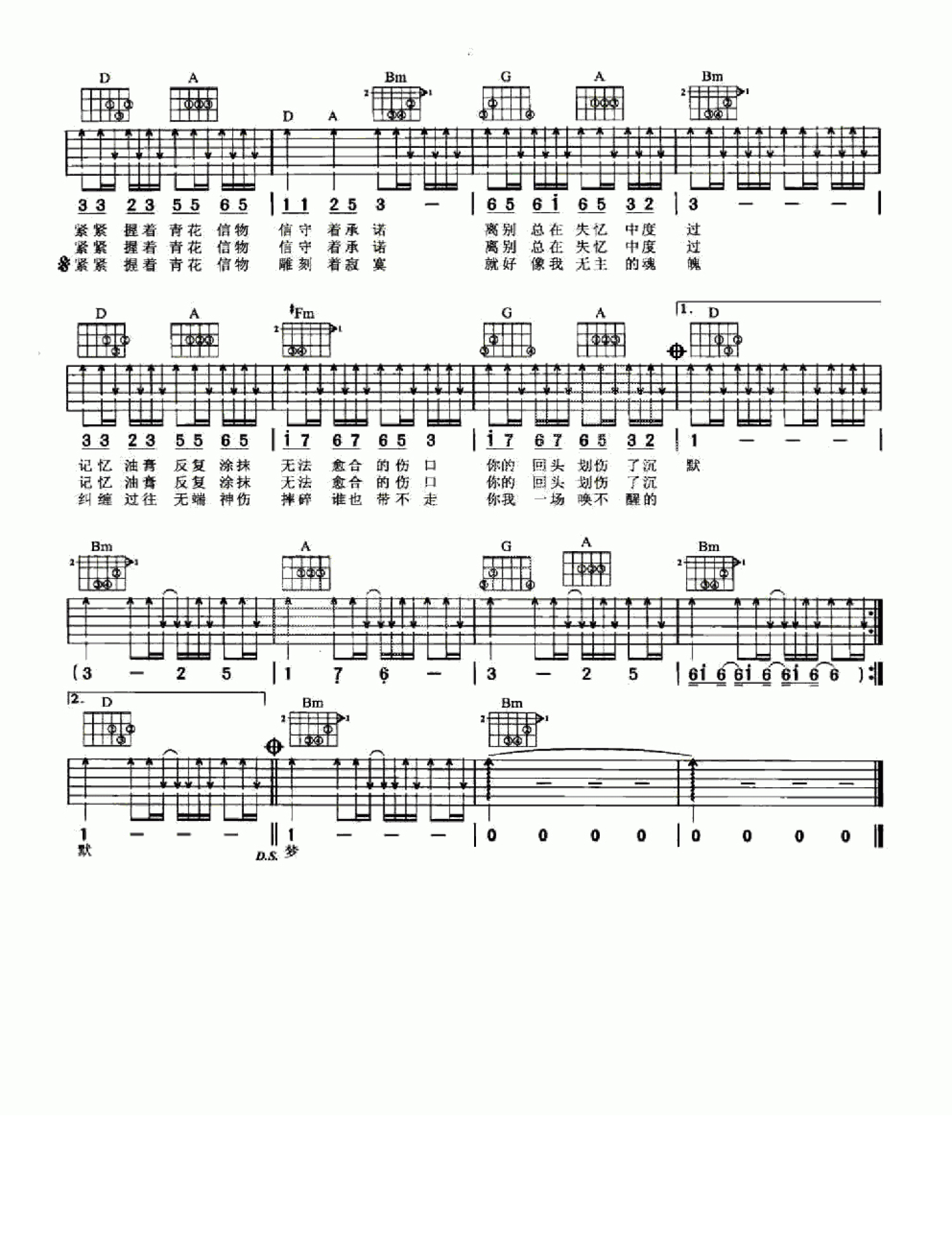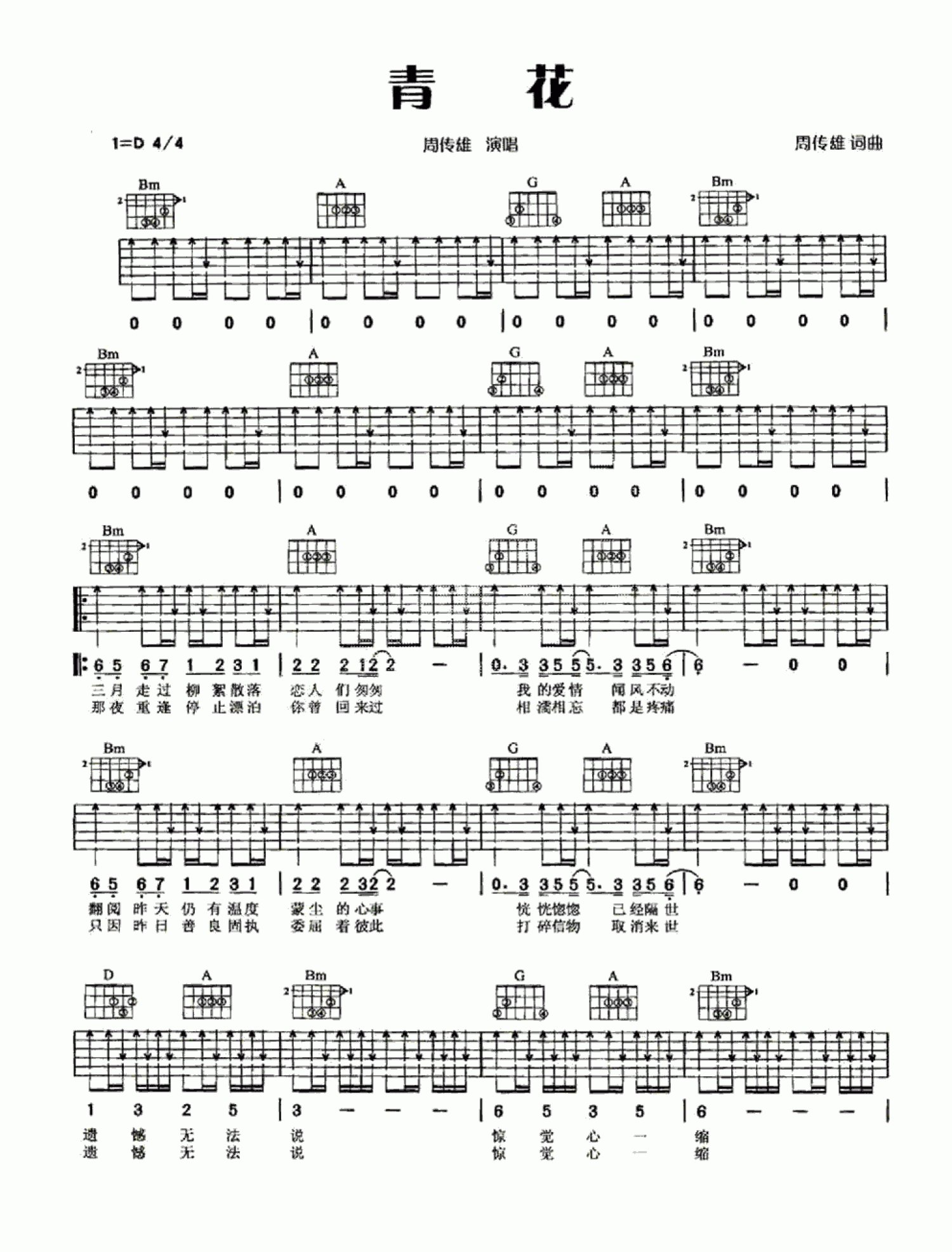 曲谱介绍: 周传雄《青花》吉他谱_D调吉他弹唱谱_扫弦版