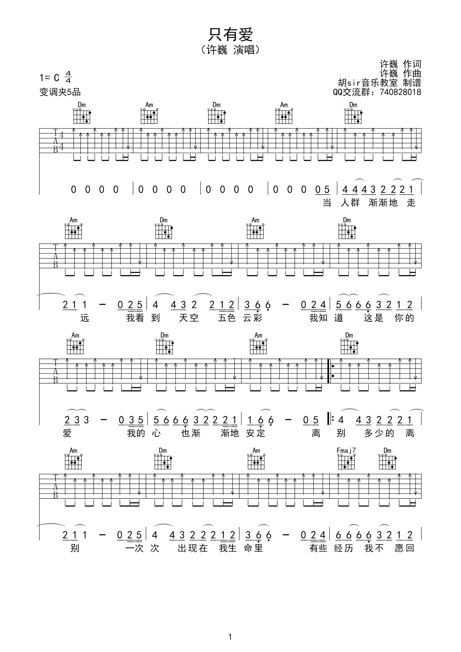 曲谱介绍: 只有爱吉他谱,许巍新专辑《无尽光芒》中的一首新歌,C调指法编配,变调夹夹五品。人群渐渐走远,许巍似乎永远是抬着头的姿态,看着霞光,看着云彩。许巍似乎有永远断不了的离别。此时,还是为你。告诉你:我爱你。