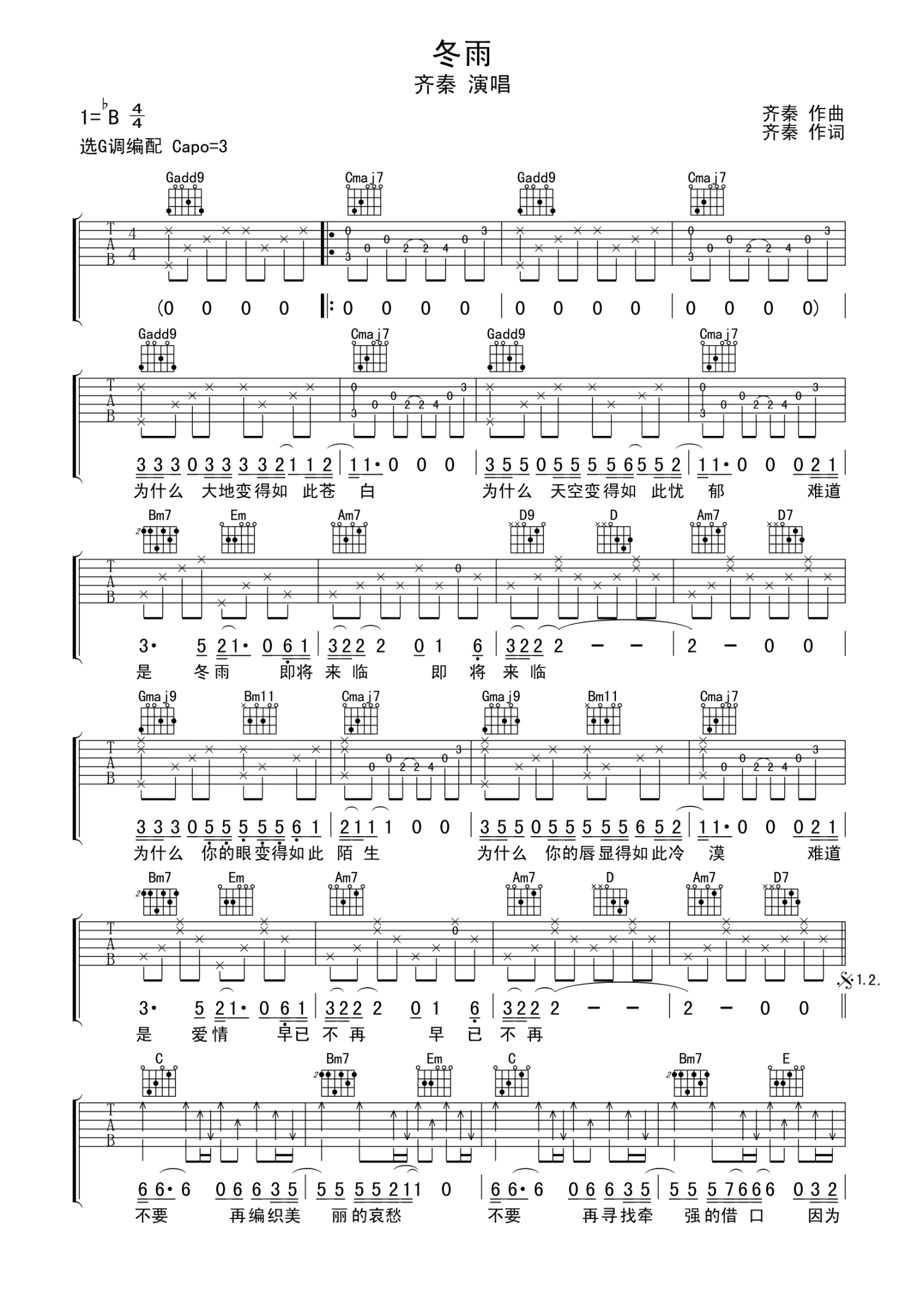 • 冬雨吉他谱 - 齐秦 - G调吉他弹唱谱第1张