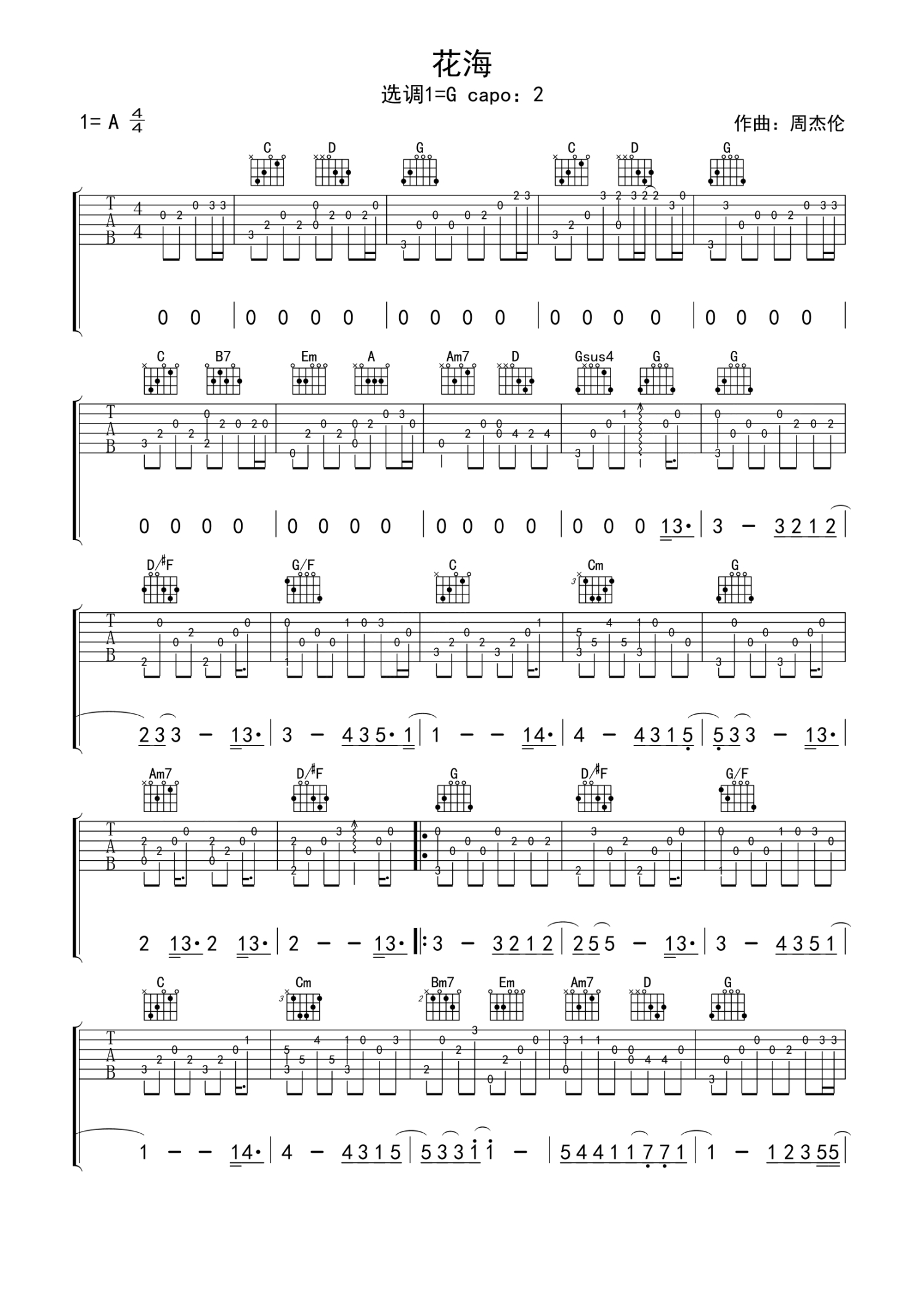 • 花海吉他谱 - 周杰伦 - G调吉他独奏谱第1张