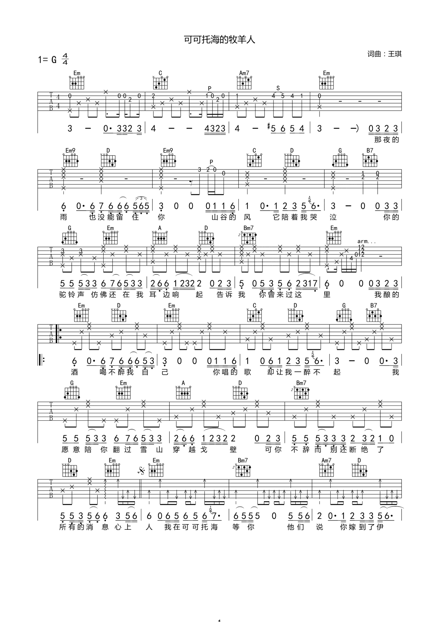 • 可可托海的牧羊人吉他谱 - 王琪 - G调吉他弹唱谱第1张