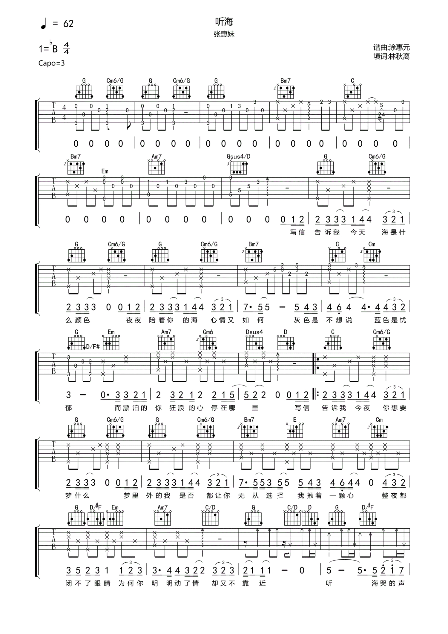 • 听海吉他谱 - 张惠妹 - G调吉他弹唱谱第1张