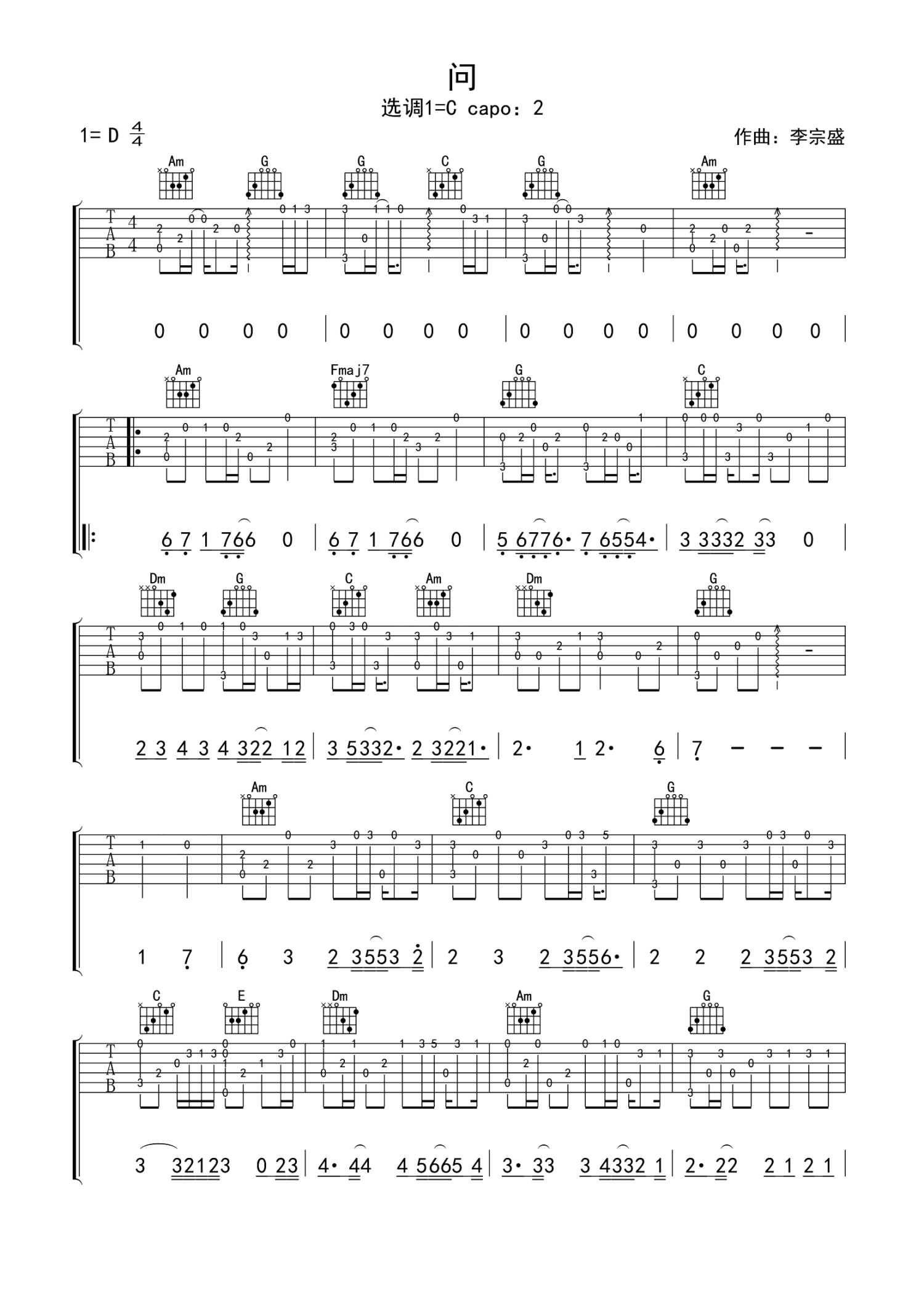 曲谱介绍: 李宗盛《问》吉他谱_C调吉他独奏谱