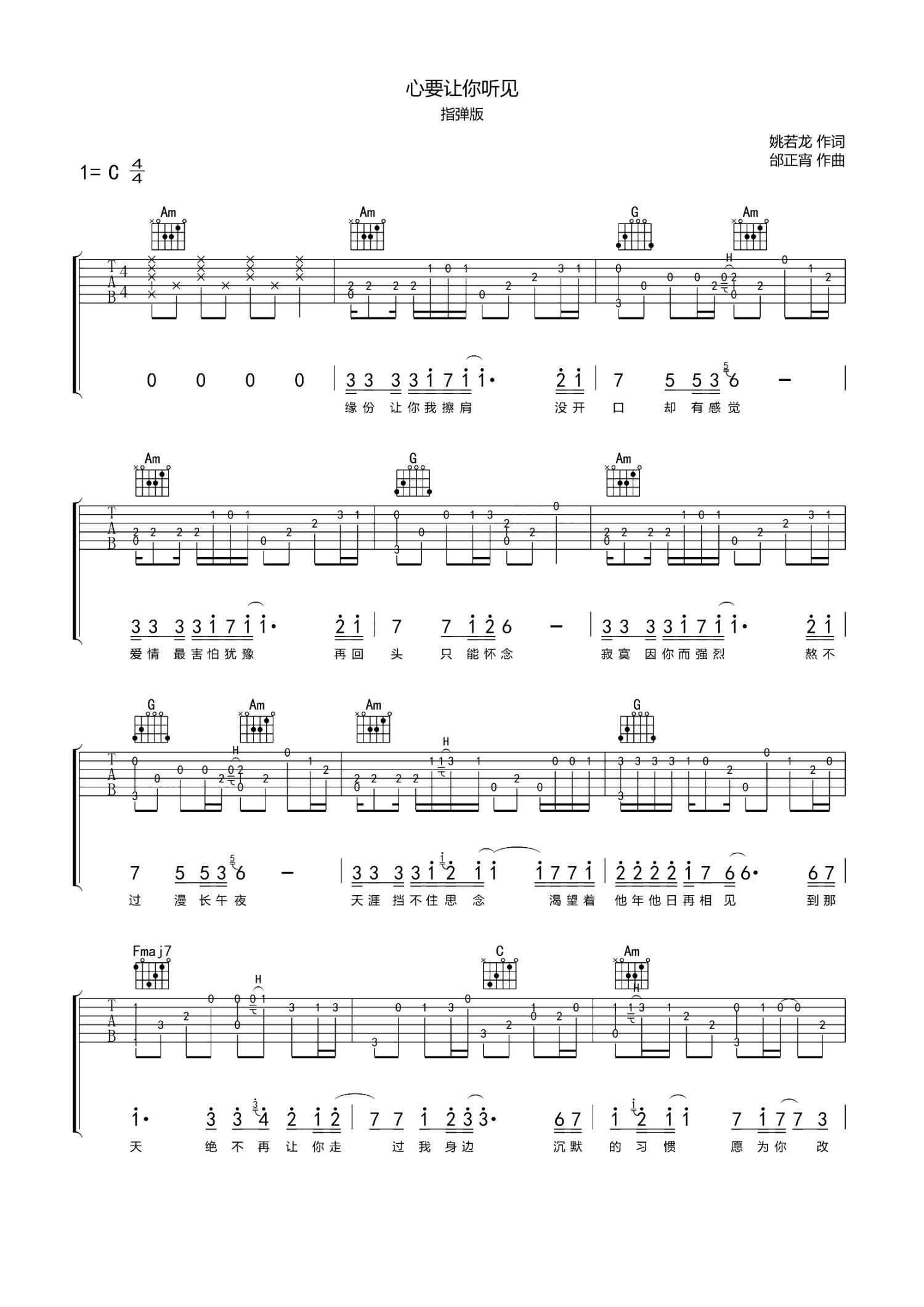 • 心要让你听见吉他谱 - 小阿枫 - C调吉他独奏谱第1张
