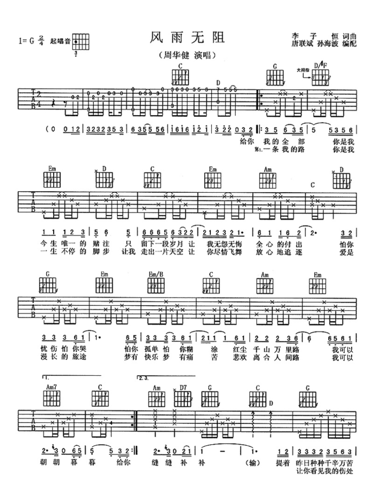 曲谱介绍: 风雨无阻吉他谱_周华健_G调_弹唱版_六线谱