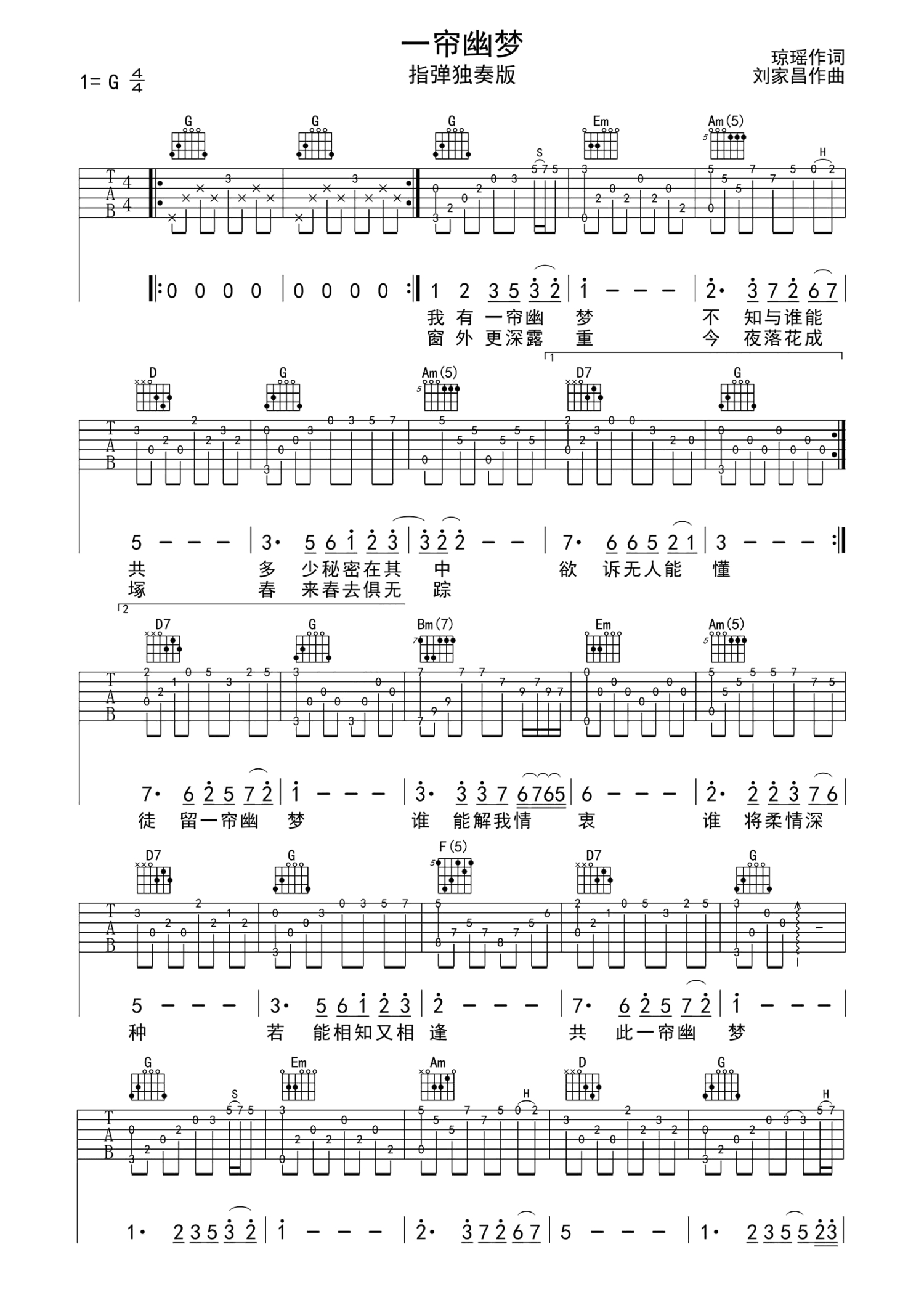 曲谱介绍: 邓丽君《一帘幽梦》吉他谱_G调吉他独奏谱