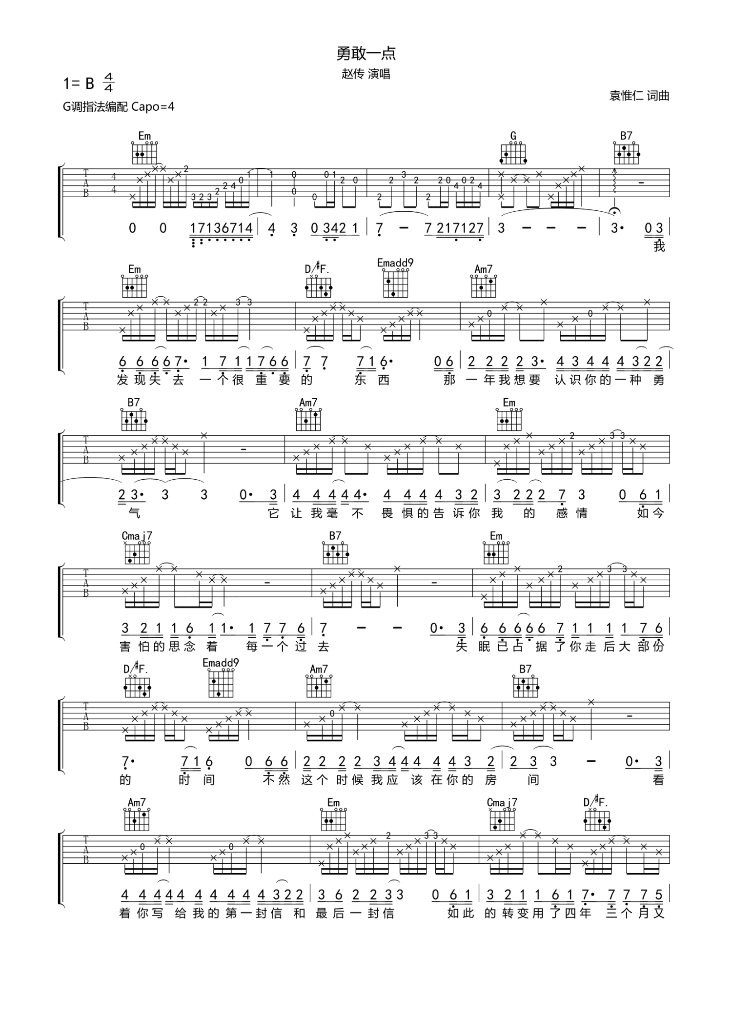 曲谱介绍: 赵传《勇敢一点》吉他谱_G调吉他弹唱谱