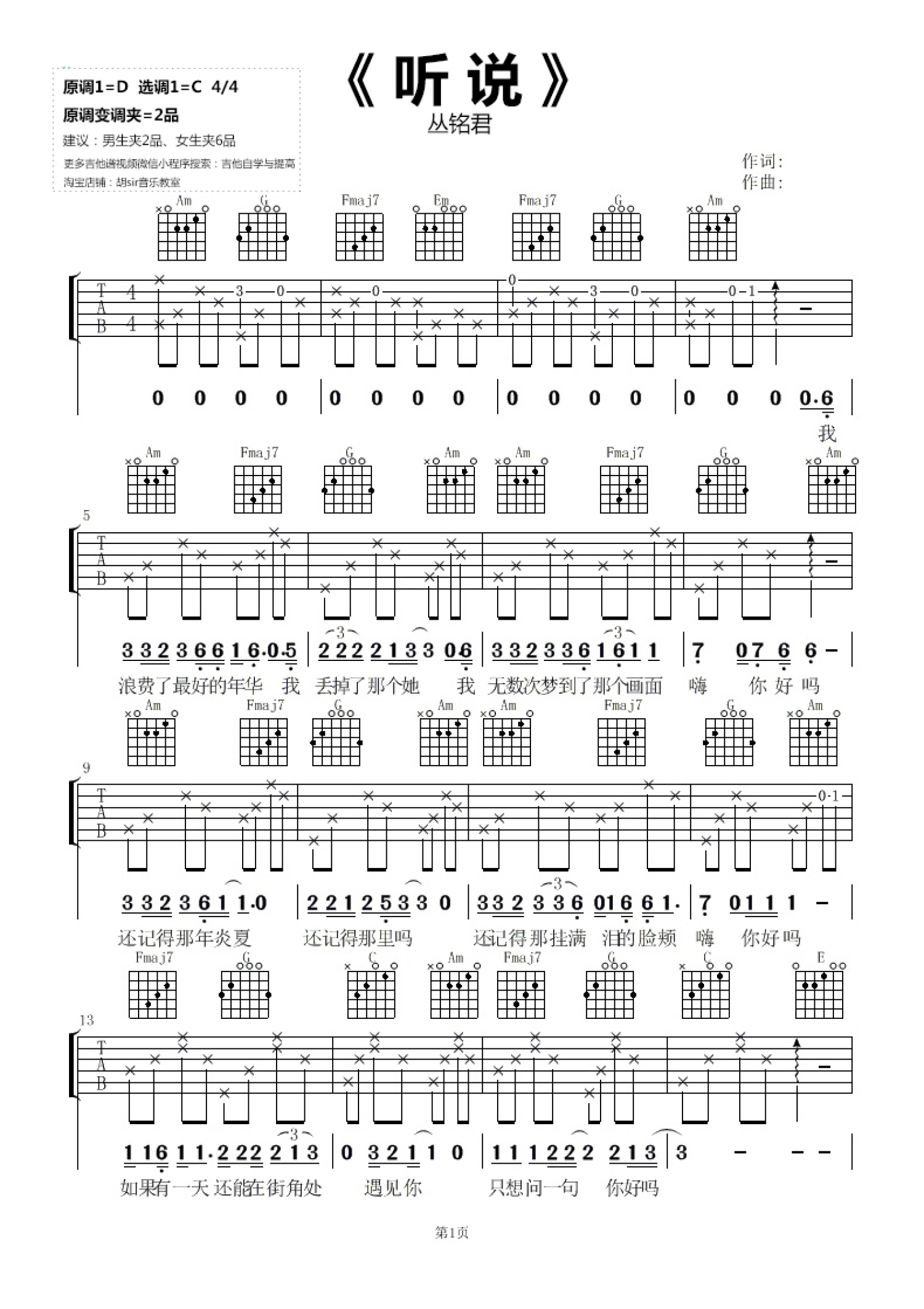 • 听说吉他谱 - 丛铭君 - C调吉他弹唱谱第1张