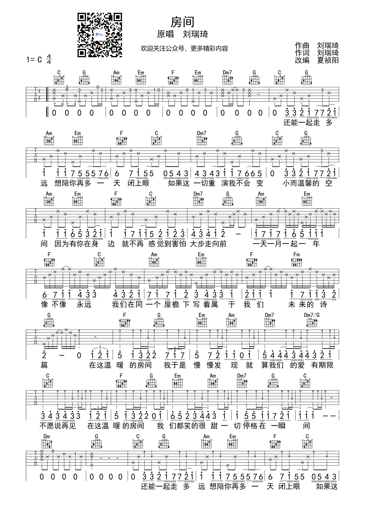 • 房间吉他谱 - 刘瑞琦 - C调吉他弹唱谱第1张