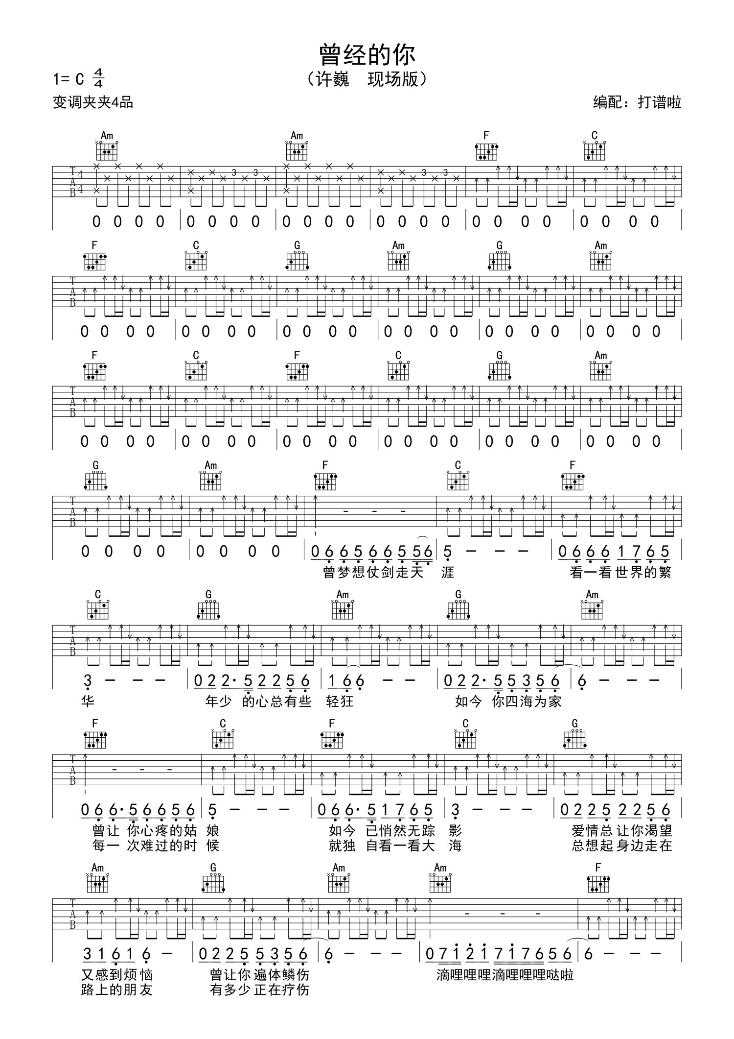 曲谱介绍: 许巍《曾经的你》吉他谱_C调吉他弹唱谱_现场版
