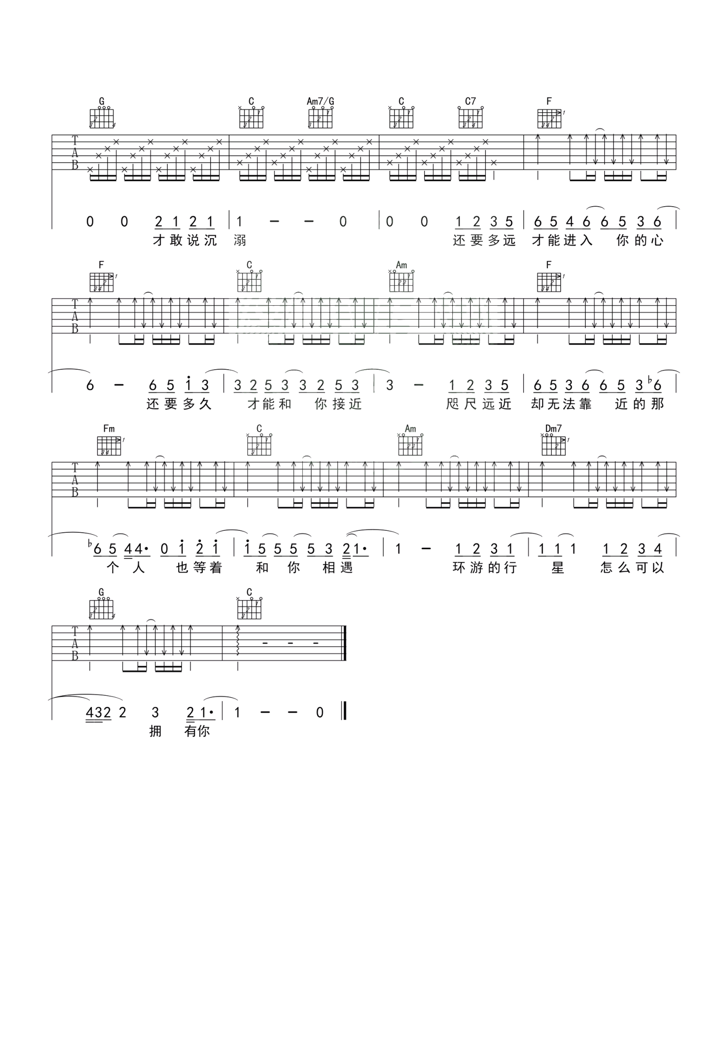 曲谱介绍: 原调F,选用C调入门版编配,capo夹五品,如果是女生弹唱建议变调夹夹三品,还要多远才能进入你的心,还有多久才能和你接近。歌曲以水星对太阳的相伴运行,来比喻人和人彼此亦远亦近的情感距离关系。