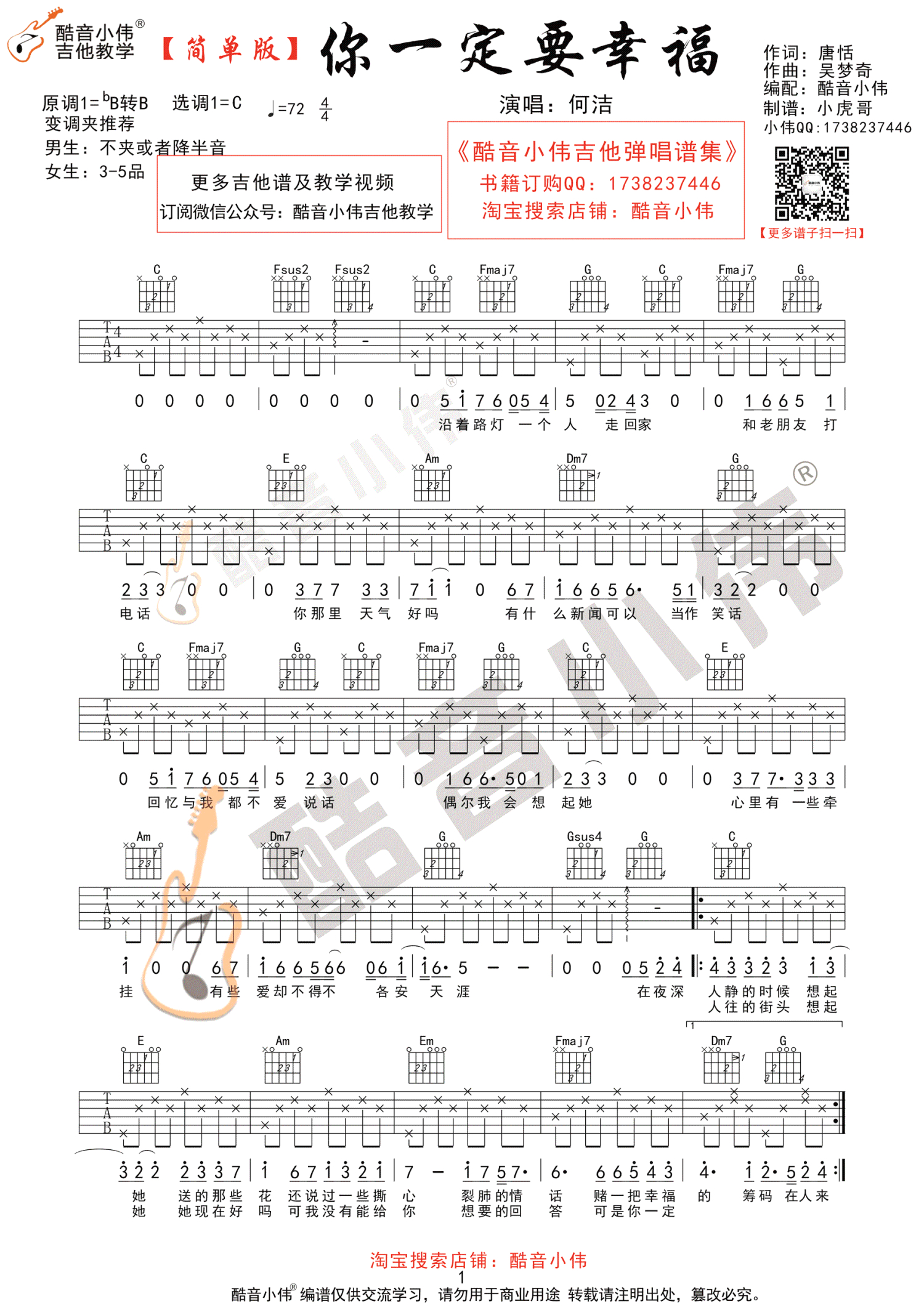 曲谱介绍: 你一定要幸福吉他谱,超女何洁的代表歌曲,变调夹推荐男生不夹或降半音调弦,女生3-5品。你一定要幸福心底藏着的那个人,无论以后是否相见,都请你一定要幸福。