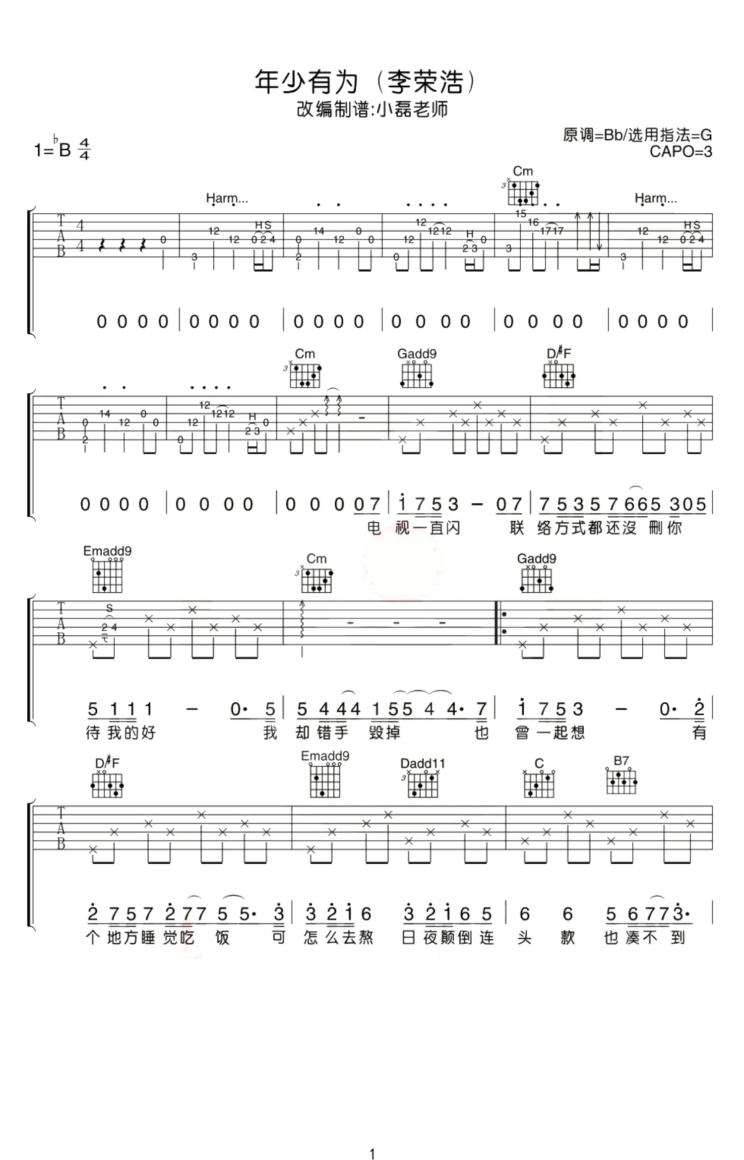 曲谱介绍: 李荣浩《年少有为》吉他谱,原调降B,选用G调指法,变调夹夹三品,随谱附上吉他弹唱教学视频。歌曲前奏保留原版泛音演奏,另外弹唱和后段的扫弦部分,难度不高,琴友们参照老师的讲解示范练习。