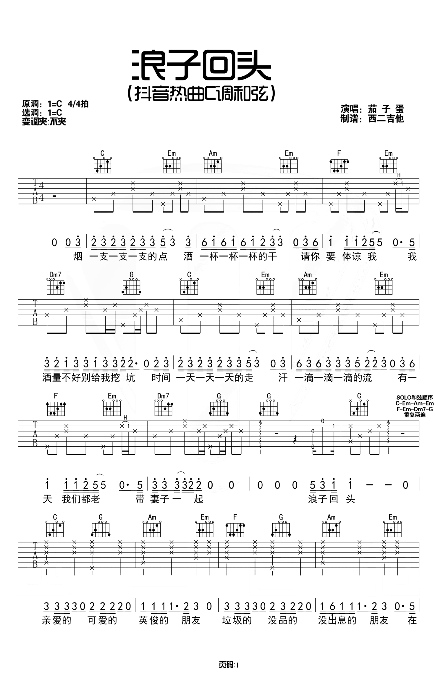 曲谱介绍: 浪子回头吉他谱,C调弹唱谱,茄子蛋一首最近超火的闽南语歌曲。曲谱编配的比较简单,男生唱比较适合,女生弹唱可以选择变调夹5-7品。对于闽南语不会的琴友来说,这首歌的歌词可以说是相当有难度了,在页面下方附上音译歌词,方便大家参照练习。婚~叽gī叽gī叽gī爹diang就~叽boy叽boy叽boy爹荡呛哩爱咿体谅哇哇酒量波候麦嘎卧葱坑西干-叽刚叽刚叽刚爹走~乌锅~叽滴叽滴叽滴爹老~嗷~乌乌叽刚-囊隆老cua波gian到丁隆子were涛hūn~jīgjīgjīgdiēdiangjiù~jīboyjīboyjīboydiēdàngqiànglǐàiyītǐliàngwawajiǔliàngbōhòumàigāwòcōngkēngxīgàn-jīgāngjīgāngjīgāngdiēzǒu~wūguō~jīdījīdījīdīdiēlǎo~áo~wūwūjīgāng-nánglónglǎocuabōgiandàodīnglóngzǐweretāo