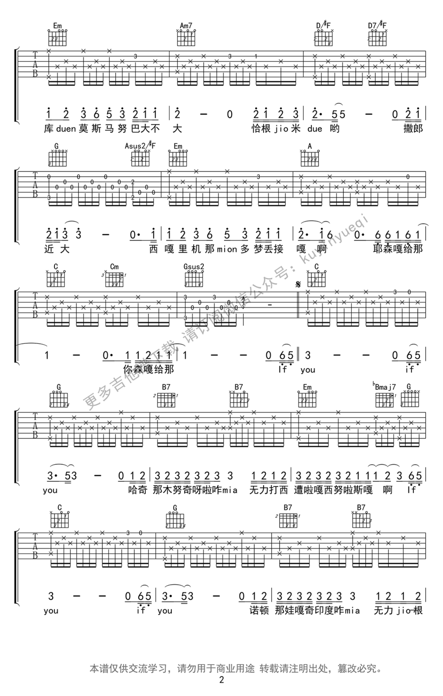 曲谱介绍: 原调#C调,选调G,变调夹夹六品。超原版好弹的IFYOU吉他六线谱,三张图片谱高清版,配中文音译歌词
