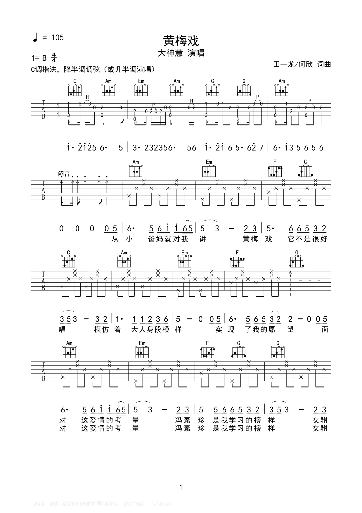 曲谱介绍: 大神慧/慕容晓晓《黄梅戏》吉他谱_C调吉他弹唱谱