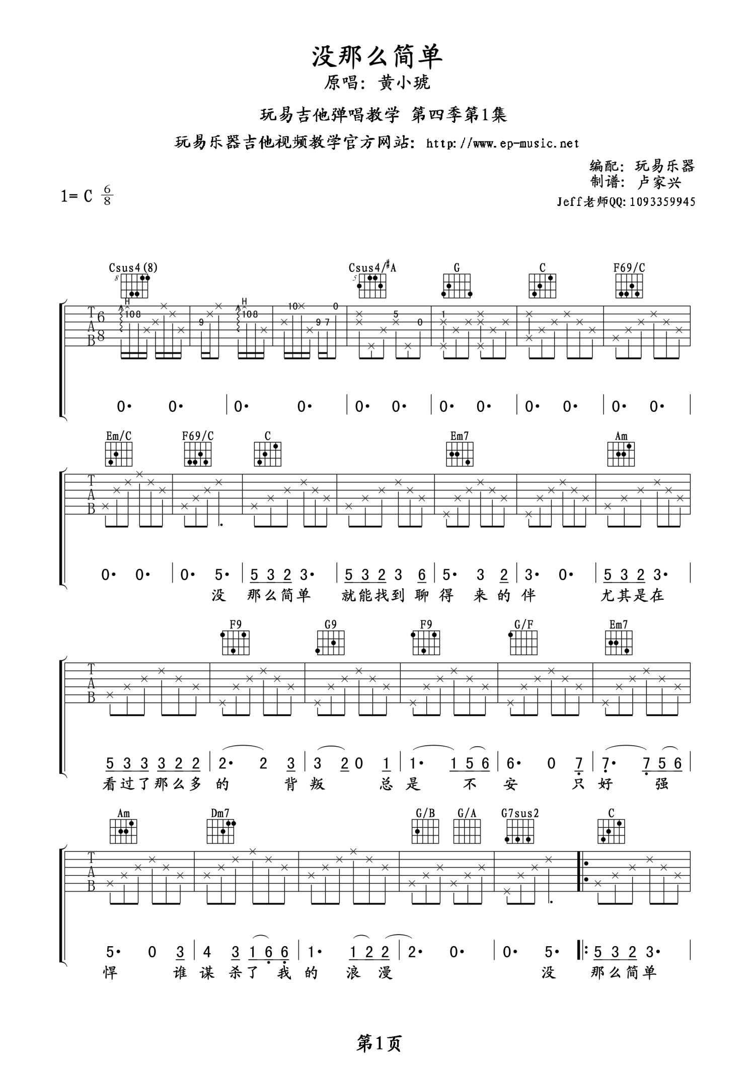 曲谱介绍: 黄小琥《没那么简单》吉他谱_C调吉他弹唱谱