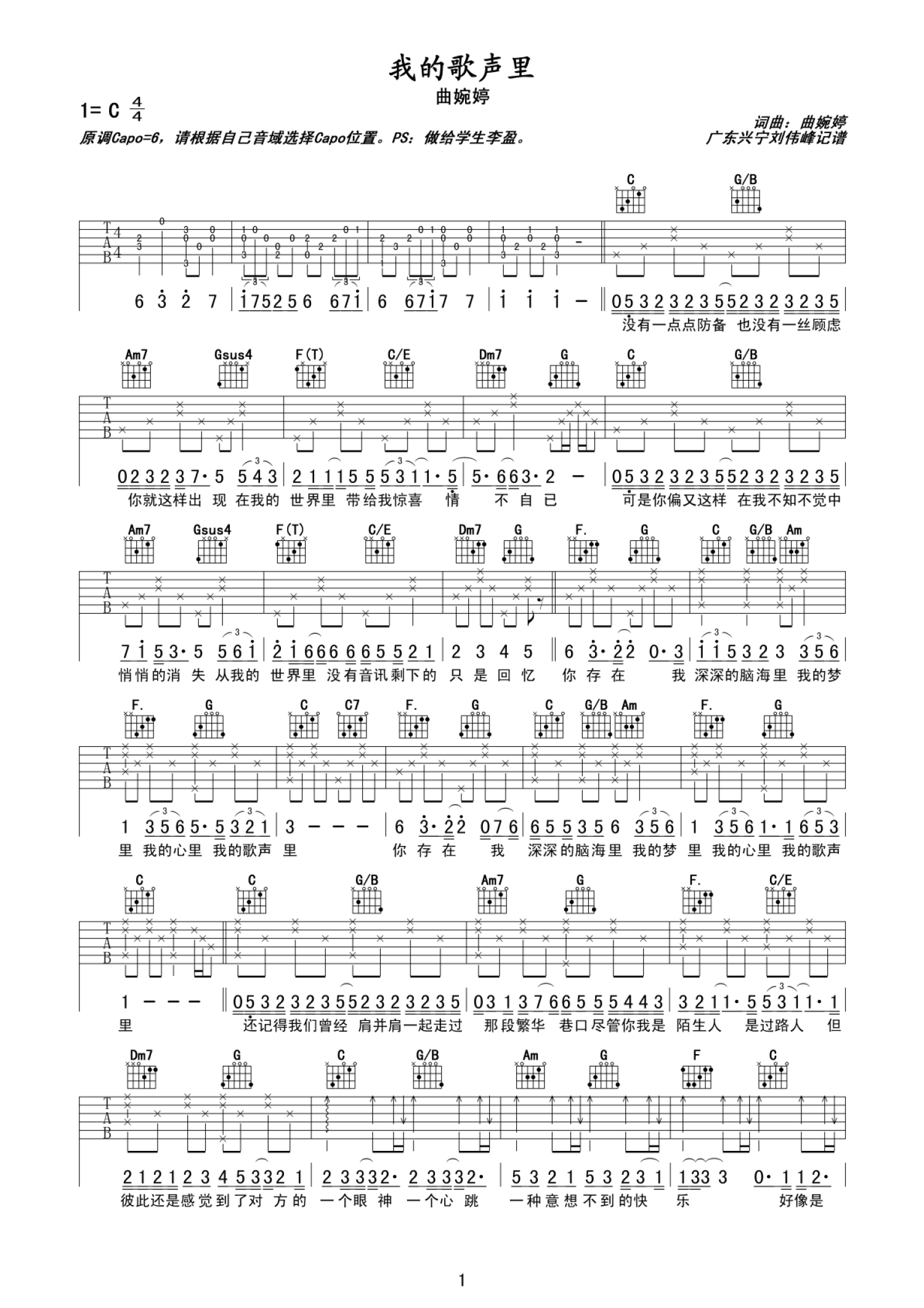 曲谱介绍: 曲婉婷我的歌声里吉他谱六线谱【高清版】