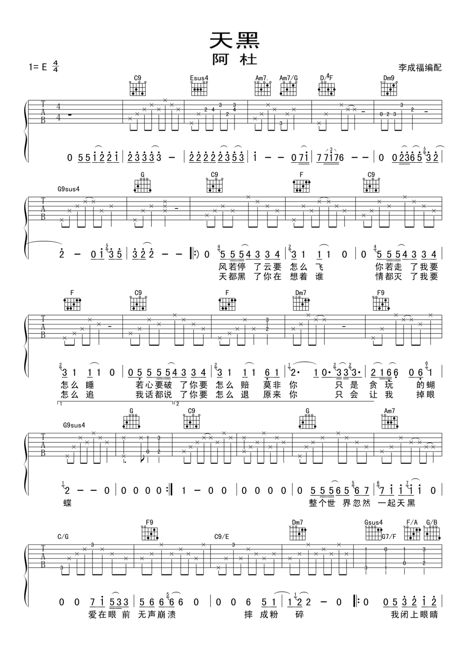 曲谱介绍: 阿杜《天黑》吉他谱_吉他弹唱谱
