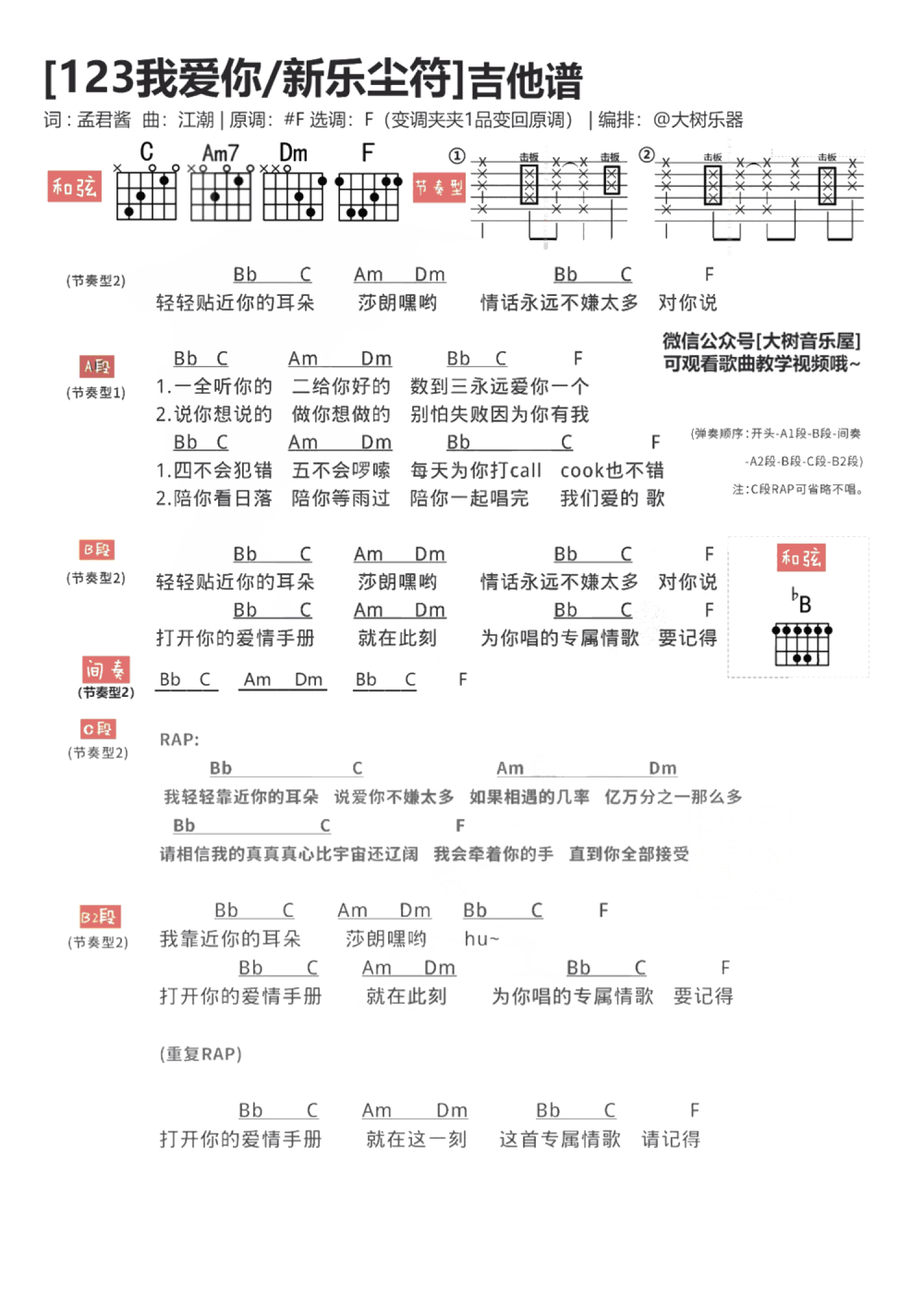 曲谱介绍: 123我爱你吉他谱,新乐尘符演唱的一首甜蜜洗脑无限循环的抖音热门歌曲,原调#F,选调F,变调夹夹一品,轻盈甜美的曲调旋律,清新浪漫的吟唱。人世间最幸福的事,就是被爱人相伴蜜宠吧。