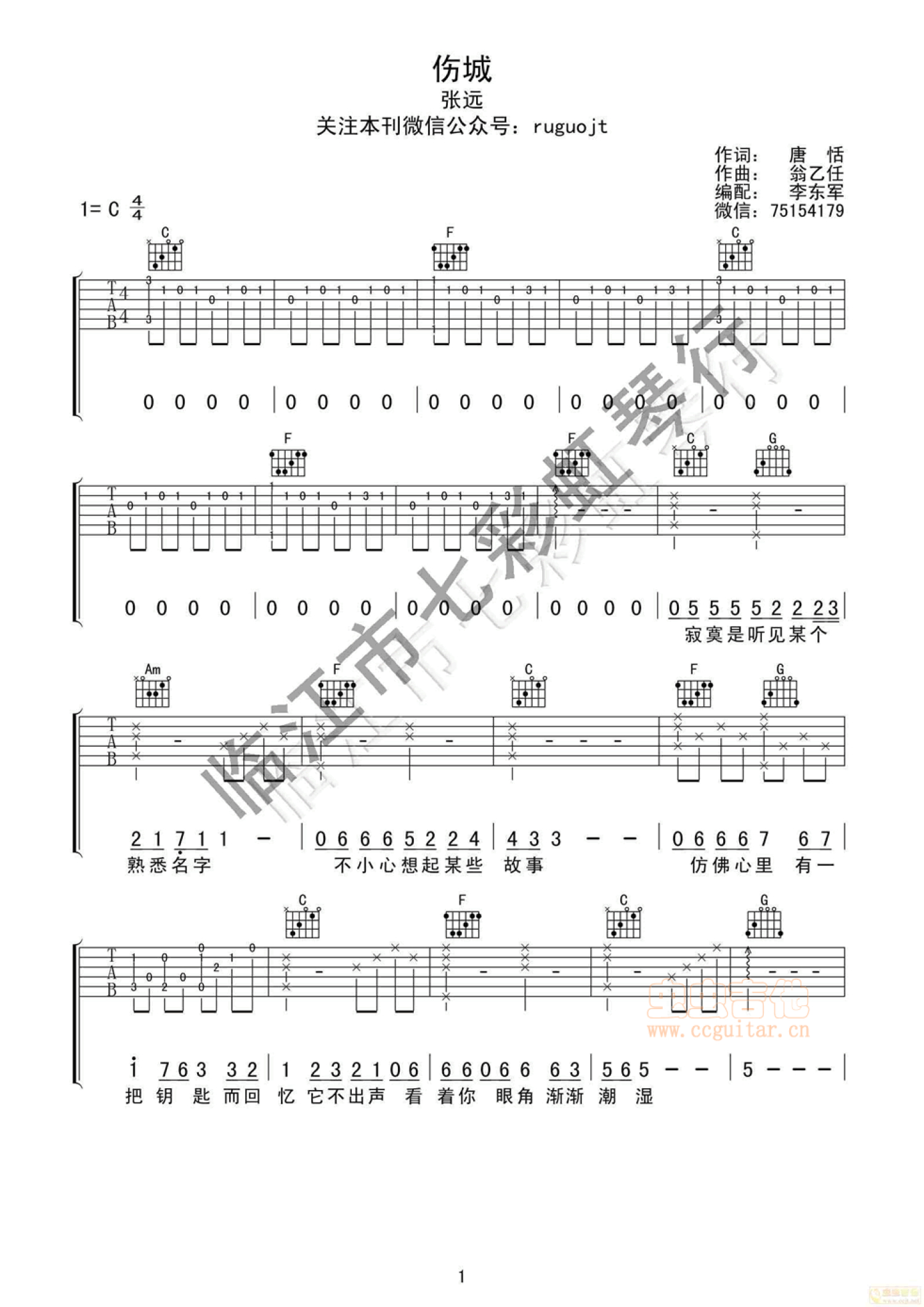 曲谱介绍: 张远《伤城》吉他谱_C调吉他弹唱谱