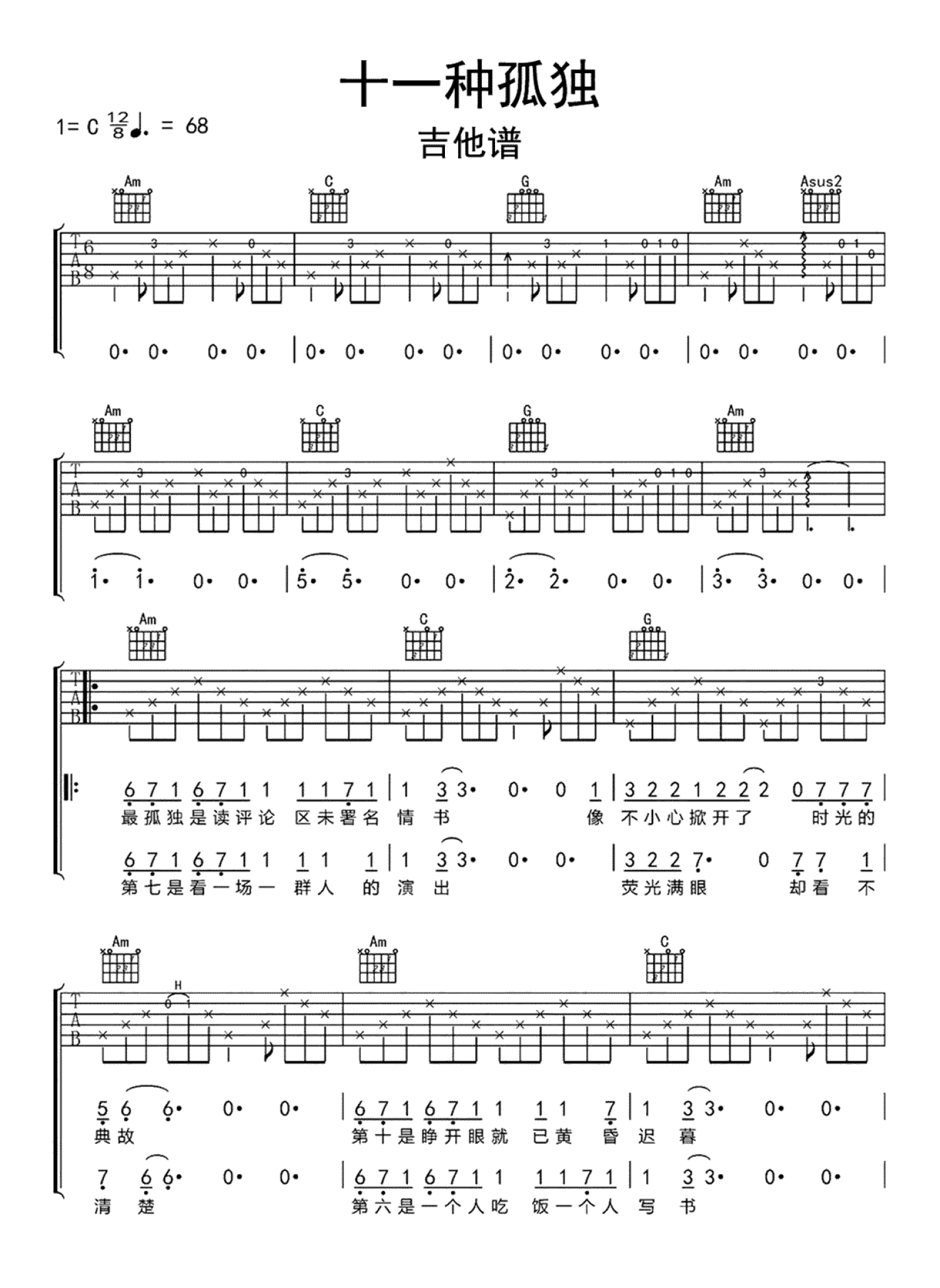 曲谱介绍: 网络歌手《十一种孤独》吉他谱_C调吉他弹唱谱